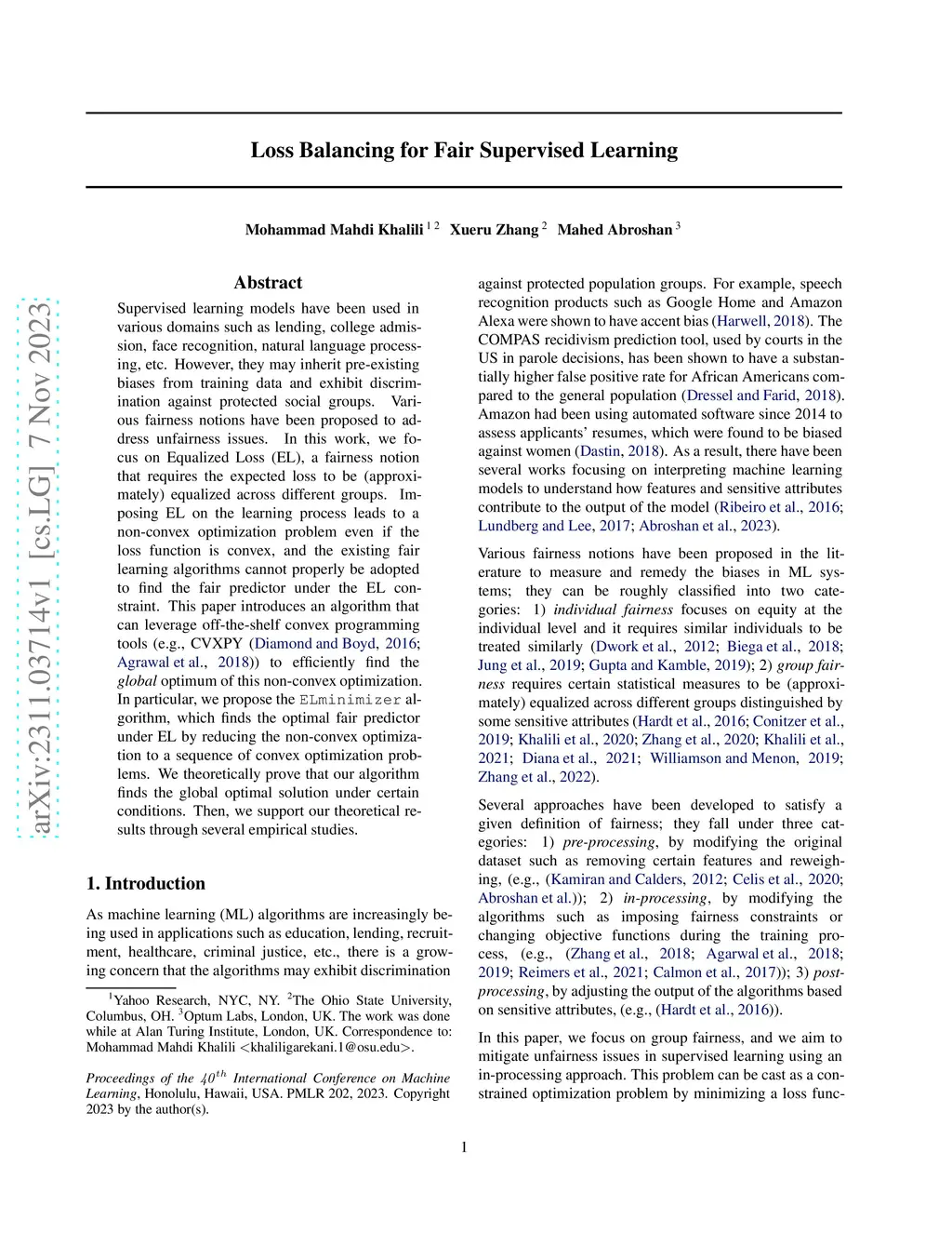 Supervised learning models have been used in various domains such as lending, college admission, face recognition, natural language processing, etc. However, they may inherit pre-existing biases from training data and exhibit discrimination against protected social groups. Various fairness notions have been proposed to address unfairness issues. In this work, we focus on Equalized Loss (EL), a fairness notion that requires the expected loss to be (approximately) equalized across different groups. Imposing EL on the learning process leads to a non-convex optimization problem even if the loss function is convex, and the existing fair learning algorithms cannot properly be adopted to find the fair predictor under the EL constraint. This paper introduces an algorithm that can leverage off-the-shelf convex programming tools (e.g., CVXPY) to efficiently find the global optimum of this non-convex optimization. In particular, we propose the ELminimizer algorithm, which finds the optimal fair predictor under EL by reducing the non-convex optimization to a sequence of convex optimization problems. We theoretically prove that our algorithm finds the global optimal solution under certain conditions. Then, we support our theoretical results through several empirical studies.