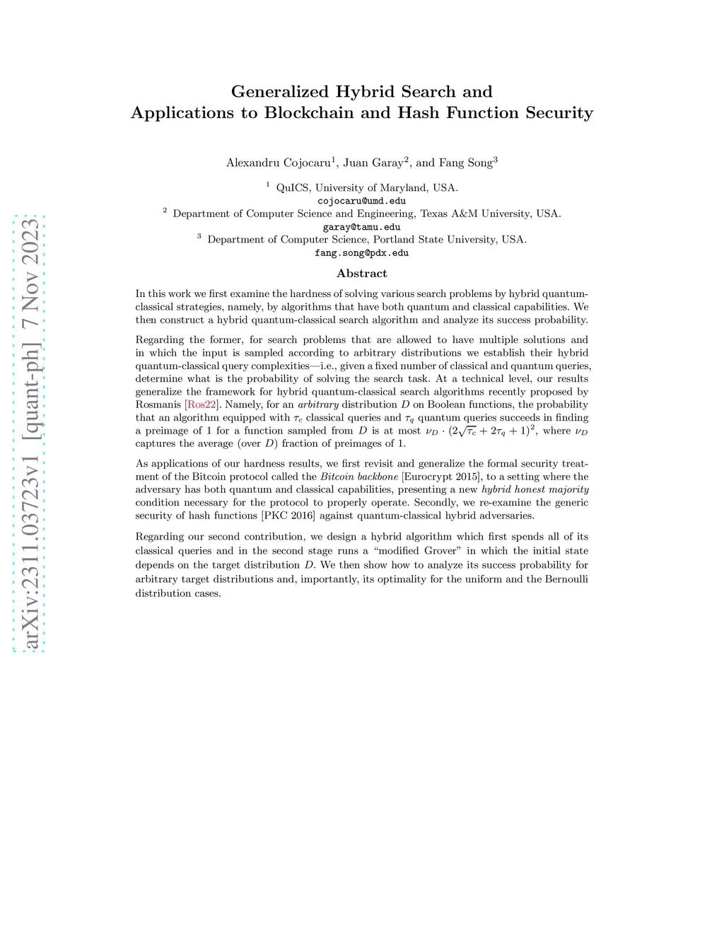 In this work we first examine the hardness of solving various search problems by hybrid quantum-classical strategies, namely, by algorithms that have both quantum and classical capabilities. We then construct a hybrid quantum-classical search algorithm and analyze its success probability. Regarding the former, for search problems that are allowed to have multiple solutions and in which the input is sampled according to arbitrary distributions we establish their hybrid quantum-classical query complexities -- i.e., given a fixed number of classical and quantum queries, determine what is the probability of solving the search task. At a technical level, our results generalize the framework for hybrid quantum-classical search algorithms proposed by Rosmanis. Namely, for an arbitrary distribution on Boolean functions, the probability an algorithm equipped with classical and quantum queries succeeds in finding a preimage of for a function sampled from is at most , where captures the average (over ) fraction of preimages of . As applications of our hardness results, we first revisit and generalize the security of the Bitcoin protocol called the Bitcoin backbone, to a setting where the adversary has both quantum and classical capabilities, presenting a new hybrid honest majority condition necessary for the protocol to properly operate. Secondly, we examine the generic security of hash functions against hybrid adversaries. Regarding our second contribution, we design a hybrid algorithm which first spends all of its classical queries and in the second stage runs a ``modified Grover'' where the initial state depends on the distribution . We show how to analyze its success probability for arbitrary target distributions and, importantly, its optimality for the uniform and the Bernoulli distribution cases.