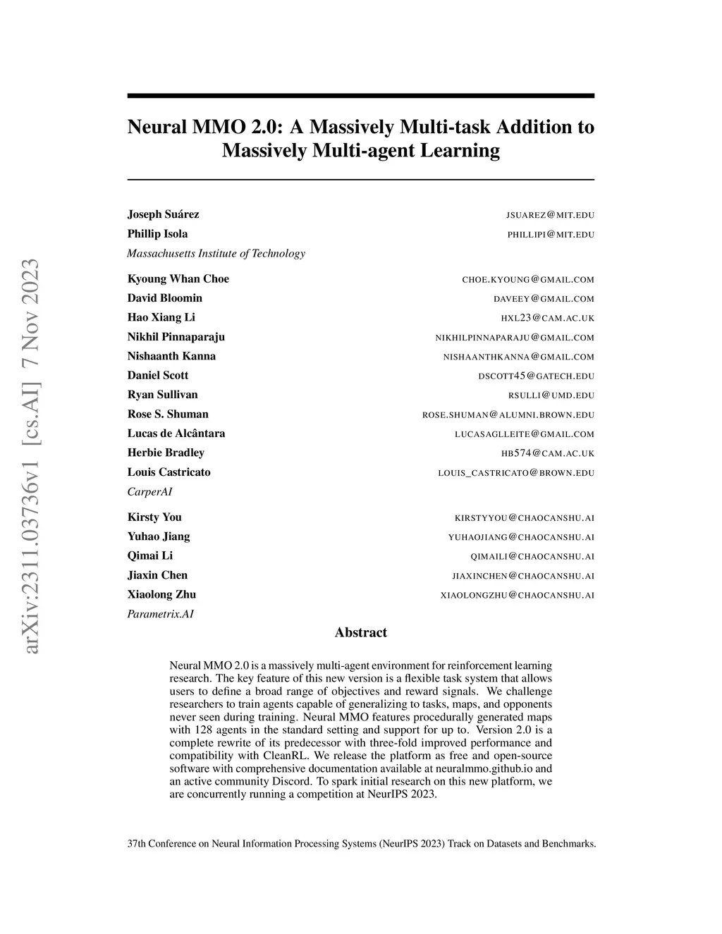 Neural MMO 2.0 is a massively multi-agent environment for reinforcement learning research. The key feature of this new version is a flexible task system that allows users to define a broad range of objectives and reward signals. We challenge researchers to train agents capable of generalizing to tasks, maps, and opponents never seen during training. Neural MMO features procedurally generated maps with 128 agents in the standard setting and support for up to. Version 2.0 is a complete rewrite of its predecessor with three-fold improved performance and compatibility with CleanRL. We release the platform as free and open-source software with comprehensive documentation available at neuralmmo.github.io and an active community Discord. To spark initial research on this new platform, we are concurrently running a competition at NeurIPS 2023.