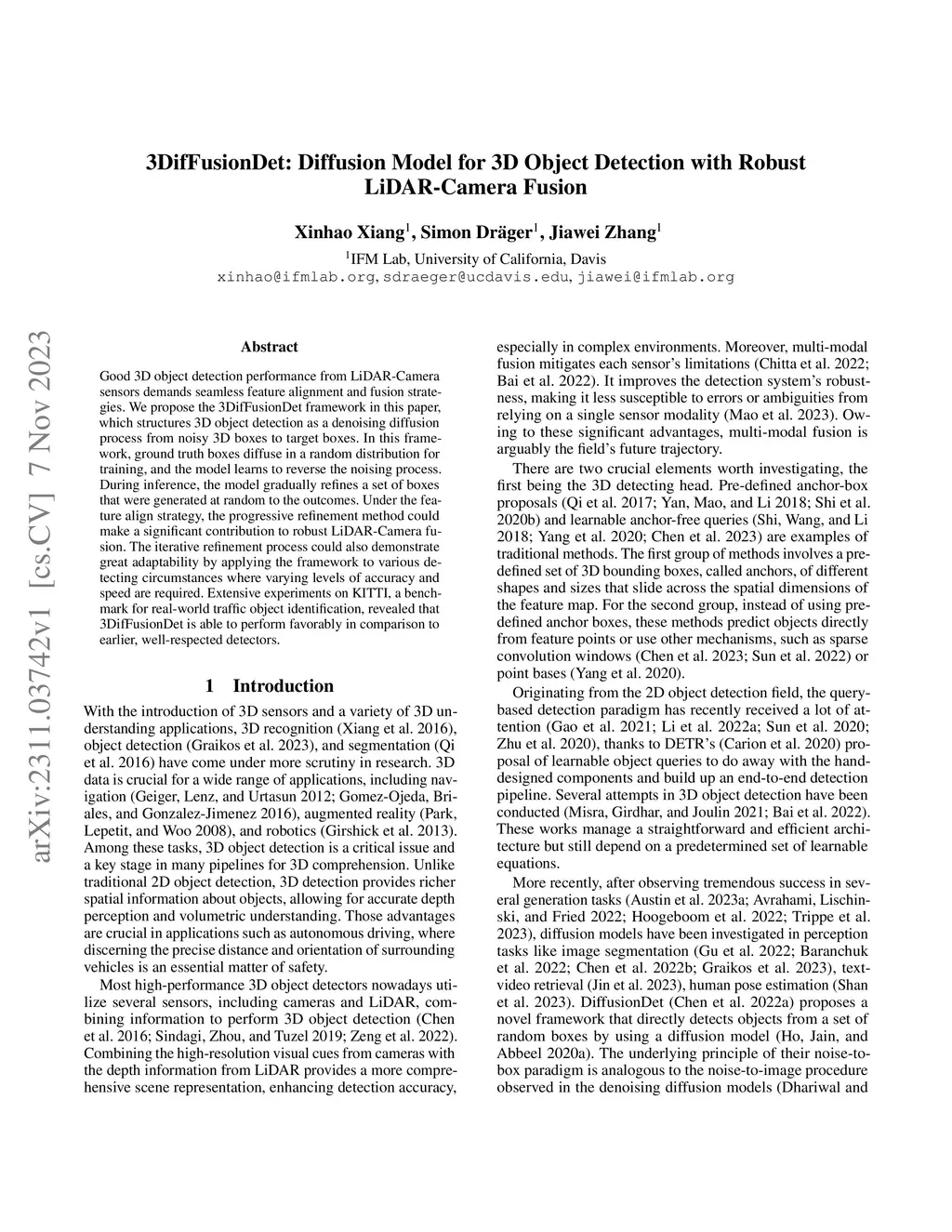 Good 3D object detection performance from LiDAR-Camera sensors demands seamless feature alignment and fusion strategies. We propose the 3DifFusionDet framework in this paper, which structures 3D object detection as a denoising diffusion process from noisy 3D boxes to target boxes. In this framework, ground truth boxes diffuse in a random distribution for training, and the model learns to reverse the noising process. During inference, the model gradually refines a set of boxes that were generated at random to the outcomes. Under the feature align strategy, the progressive refinement method could make a significant contribution to robust LiDAR-Camera fusion. The iterative refinement process could also demonstrate great adaptability by applying the framework to various detecting circumstances where varying levels of accuracy and speed are required. Extensive experiments on KITTI, a benchmark for real-world traffic object identification, revealed that 3DifFusionDet is able to perform favorably in comparison to earlier, well-respected detectors.