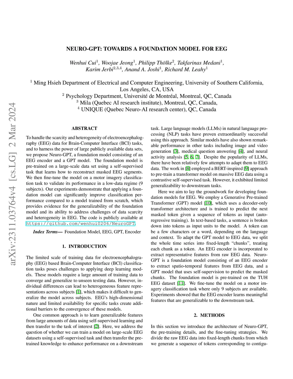 To handle the scarcity and heterogeneity of electroencephalography (EEG) data for Brain-Computer Interface (BCI) tasks, and to harness the power of large publicly available data sets, we propose Neuro-GPT, a foundation model consisting of an EEG encoder and a GPT model. The foundation model is pre-trained on a large-scale data set using a self-supervised task that learns how to reconstruct masked EEG segments. We then fine-tune the model on a Motor Imagery Classification task to validate its performance in a low-data regime (9 subjects). Our experiments demonstrate that applying a foundation model can significantly improve classification performance compared to a model trained from scratch, which provides evidence for the generalizability of the foundation model and its ability to address challenges of data scarcity and heterogeneity in EEG. The code is publicly available at github.com/wenhui0206/NeuroGPT.