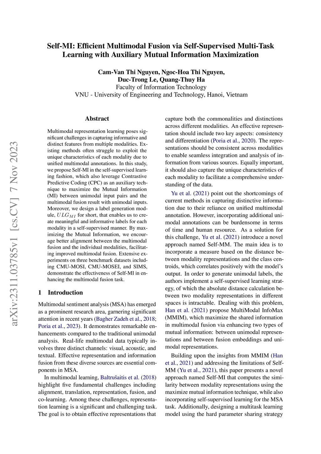 Self-MI: Efficient Multimodal Fusion via Self-Supervised Multi-Task