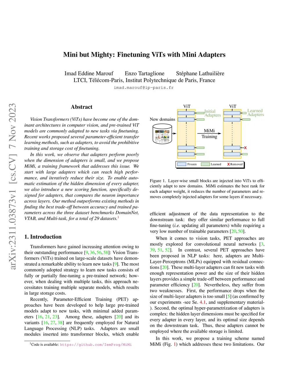 Vision Transformers (ViTs) have become one of the dominant architectures in computer vision, and pre-trained ViT models are commonly adapted to new tasks via fine-tuning. Recent works proposed several parameter-efficient transfer learning methods, such as adapters, to avoid the prohibitive training and storage cost of finetuning. In this work, we observe that adapters perform poorly when the dimension of adapters is small, and we propose MiMi, a training framework that addresses this issue. We start with large adapters which can reach high performance, and iteratively reduce their size. To enable automatic estimation of the hidden dimension of every adapter, we also introduce a new scoring function, specifically designed for adapters, that compares the neuron importance across layers. Our method outperforms existing methods in finding the best trade-off between accuracy and trained parameters across the three dataset benchmarks DomainNet, VTAB, and Multi-task, for a total of 29 datasets.
