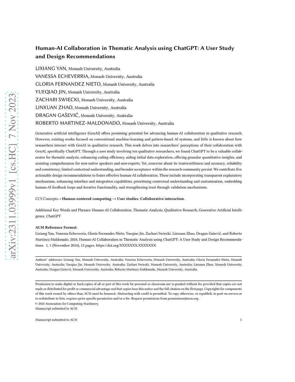 Generative artificial intelligence (GenAI) offers promising potential for advancing human-AI collaboration in qualitative research. However, existing works focused on conventional machine-learning and pattern-based AI systems, and little is known about how researchers interact with GenAI in qualitative research. This work delves into researchers' perceptions of their collaboration with GenAI, specifically ChatGPT. Through a user study involving ten qualitative researchers, we found ChatGPT to be a valuable collaborator for thematic analysis, enhancing coding efficiency, aiding initial data exploration, offering granular quantitative insights, and assisting comprehension for non-native speakers and non-experts. Yet, concerns about its trustworthiness and accuracy, reliability and consistency, limited contextual understanding, and broader acceptance within the research community persist. We contribute five actionable design recommendations to foster effective human-AI collaboration. These include incorporating transparent explanatory mechanisms, enhancing interface and integration capabilities, prioritising contextual understanding and customisation, embedding human-AI feedback loops and iterative functionality, and strengthening trust through validation mechanisms.