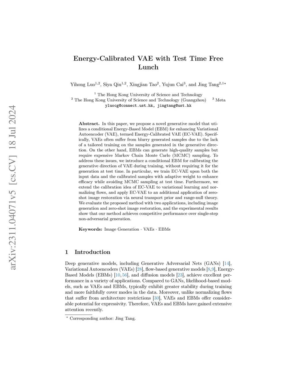 In this paper, we propose a novel generative model that utilizes a conditional Energy-Based Model (EBM) for enhancing Variational Autoencoder (VAE), termed Energy-Calibrated VAE (EC-VAE). Specifically, VAEs often suffer from blurry generated samples due to the lack of a tailored training on the samples generated in the generative direction. On the other hand, EBMs can generate high-quality samples but require expensive Markov Chain Monte Carlo (MCMC) sampling. To address these issues, we introduce a conditional EBM for calibrating the generative direction of VAE during training, without requiring it for the generation at test time. In particular, we train EC-VAE upon both the input data and the calibrated samples with adaptive weight to enhance efficacy while avoiding MCMC sampling at test time. Furthermore, we extend the calibration idea of EC-VAE to variational learning and normalizing flows, and apply EC-VAE to an additional application of zero-shot image restoration via neural transport prior and range-null theory. We evaluate the proposed method with two applications, including image generation and zero-shot image restoration, and the experimental results show that our method achieves competitive performance over single-step non-adversarial generation. Our code is available at https://github.com/DJ-LYH/EC-VAE.