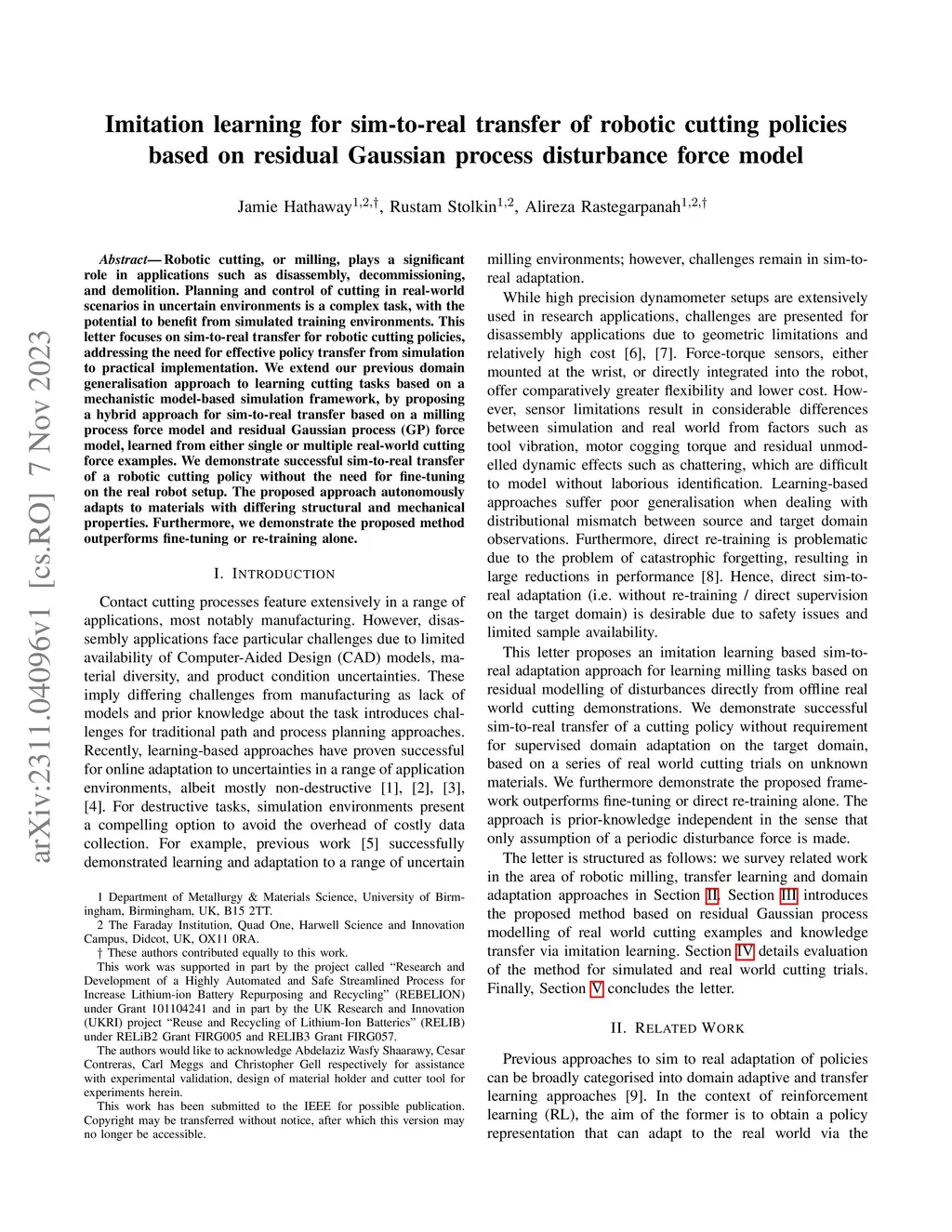 Robotic cutting, or milling, plays a significant role in applications such as disassembly, decommissioning, and demolition. Planning and control of cutting in real-world scenarios in uncertain environments is a complex task, with the potential to benefit from simulated training environments. This letter focuses on sim-to-real transfer for robotic cutting policies, addressing the need for effective policy transfer from simulation to practical implementation. We extend our previous domain generalisation approach to learning cutting tasks based on a mechanistic model-based simulation framework, by proposing a hybrid approach for sim-to-real transfer based on a milling process force model and residual Gaussian process (GP) force model, learned from either single or multiple real-world cutting force examples. We demonstrate successful sim-to-real transfer of a robotic cutting policy without the need for fine-tuning on the real robot setup. The proposed approach autonomously adapts to materials with differing structural and mechanical properties. Furthermore, we demonstrate the proposed method outperforms fine-tuning or re-training alone.
