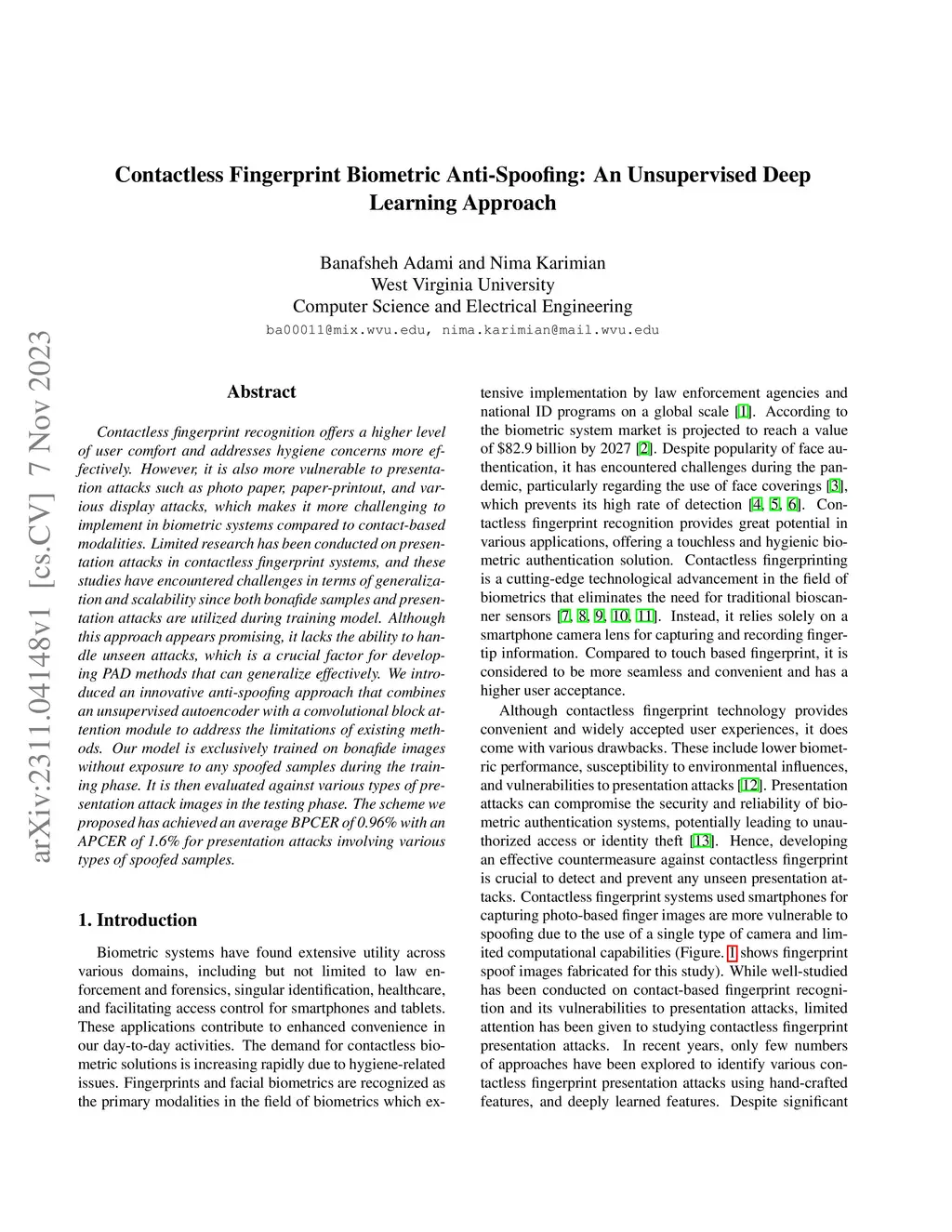Contactless Fingerprint Biometric Anti-Spoofing: An Unsupervised Deep
