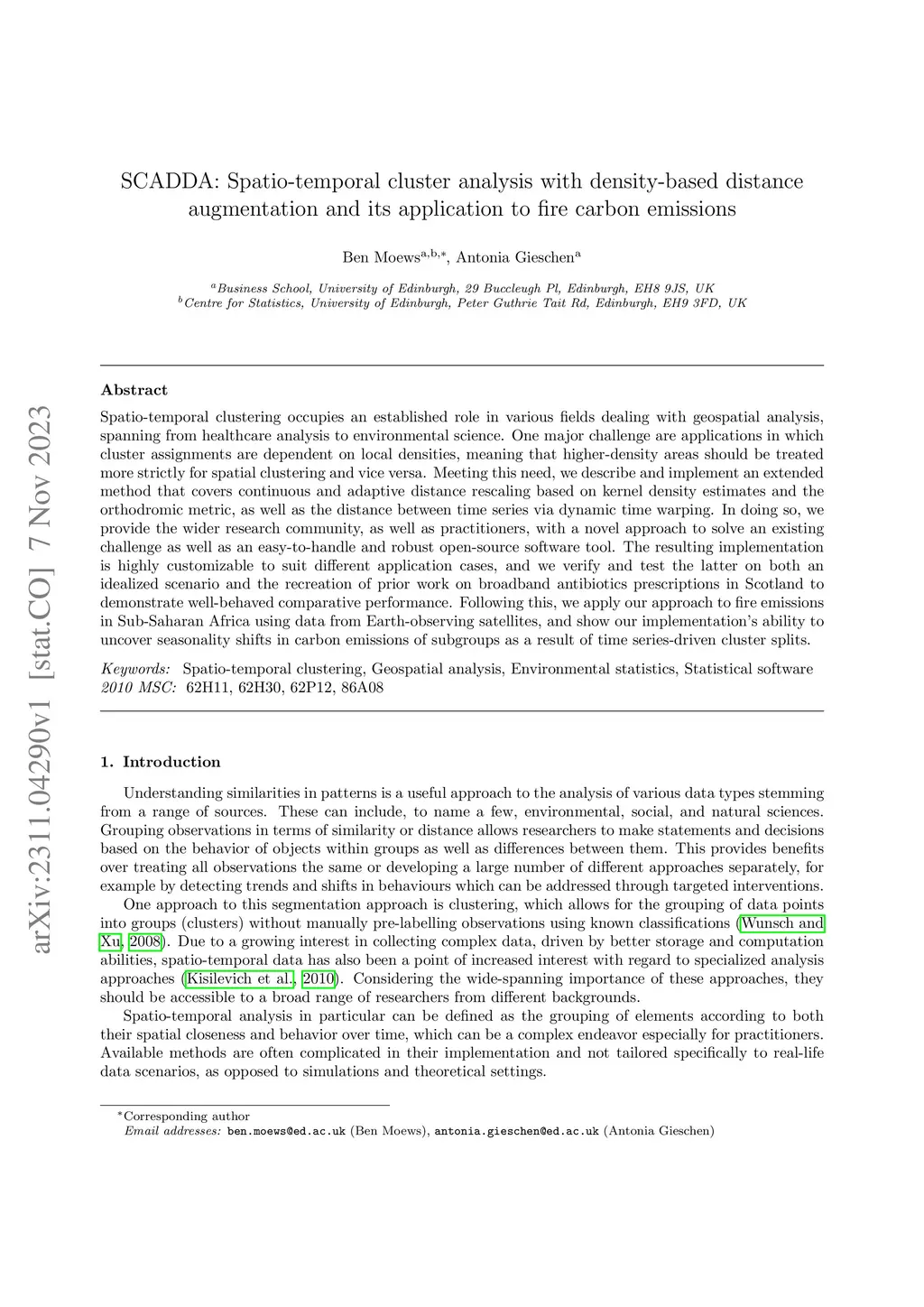 Spatio-temporal clustering occupies an established role in various fields dealing with geospatial analysis, spanning from healthcare analysis to environmental science. One major challenge are applications in which cluster assignments are dependent on local densities, meaning that higher-density areas should be treated more strictly for spatial clustering and vice versa. Meeting this need, we describe and implement an extended method that covers continuous and adaptive distance rescaling based on kernel density estimates and the orthodromic metric, as well as the distance between time series via dynamic time warping. In doing so, we provide the wider research community, as well as practitioners, with a novel approach to solve an existing challenge as well as an easy-to-handle and robust open-source software tool. The resulting implementation is highly customizable to suit different application cases, and we verify and test the latter on both an idealized scenario and the recreation of prior work on broadband antibiotics prescriptions in Scotland to demonstrate well-behaved comparative performance. Following this, we apply our approach to fire emissions in Sub-Saharan Africa using data from Earth-observing satellites, and show our implementation's ability to uncover seasonality shifts in carbon emissions of subgroups as a result of time series-driven cluster splits.