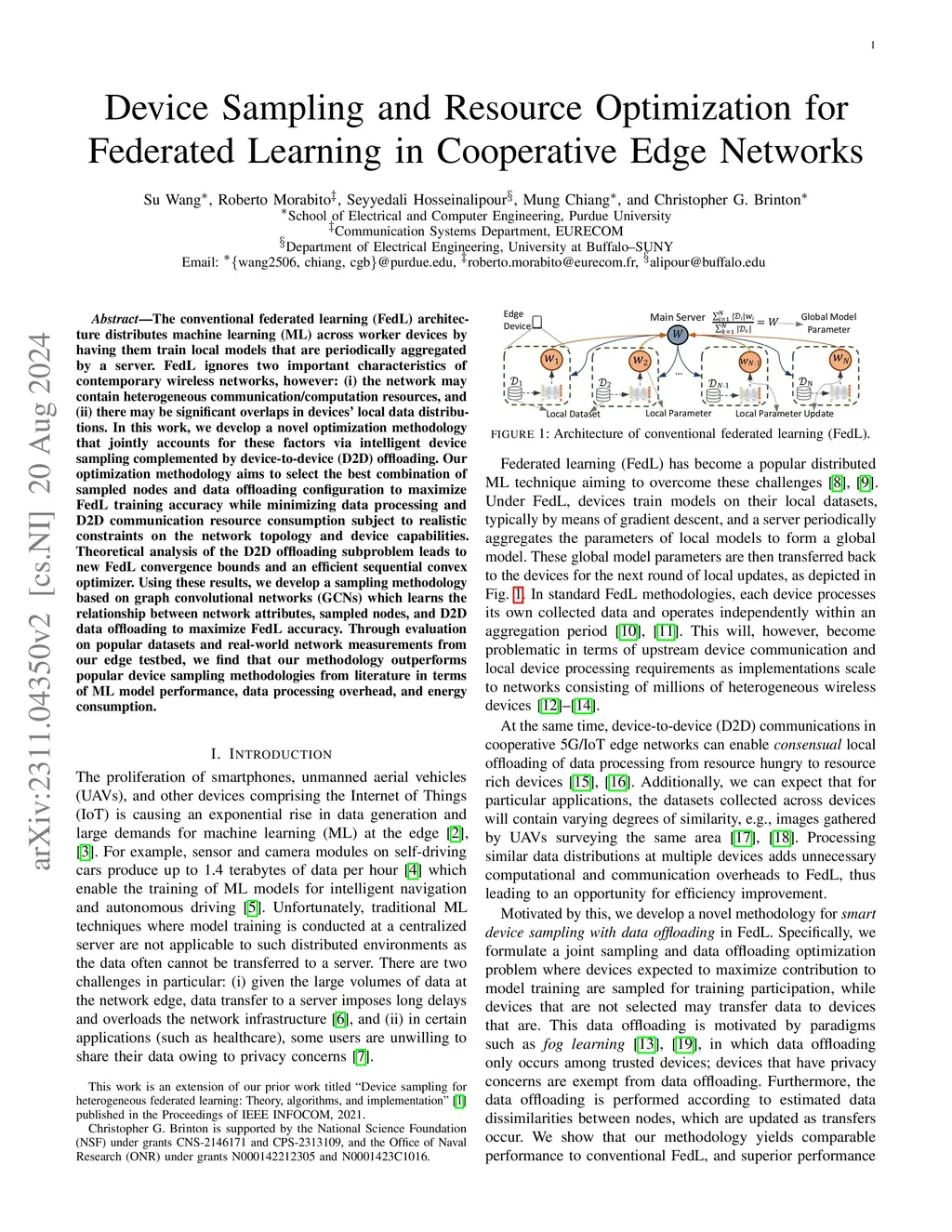 The conventional federated learning (FedL) architecture distributes machine learning (ML) across worker devices by having them train local models that are periodically aggregated by a server. FedL ignores two important characteristics of contemporary wireless networks, however: (i) the network may contain heterogeneous communication/computation resources, and (ii) there may be significant overlaps in devices' local data distributions. In this work, we develop a novel optimization methodology that jointly accounts for these factors via intelligent device sampling complemented by device-to-device (D2D) offloading. Our optimization methodology aims to select the best combination of sampled nodes and data offloading configuration to maximize FedL training accuracy while minimizing data processing and D2D communication resource consumption subject to realistic constraints on the network topology and device capabilities. Theoretical analysis of the D2D offloading subproblem leads to new FedL convergence bounds and an efficient sequential convex optimizer. Using these results, we develop a sampling methodology based on graph convolutional networks (GCNs) which learns the relationship between network attributes, sampled nodes, and D2D data offloading to maximize FedL accuracy. Through evaluation on popular datasets and real-world network measurements from our edge testbed, we find that our methodology outperforms popular device sampling methodologies from literature in terms of ML model performance, data processing overhead, and energy consumption.