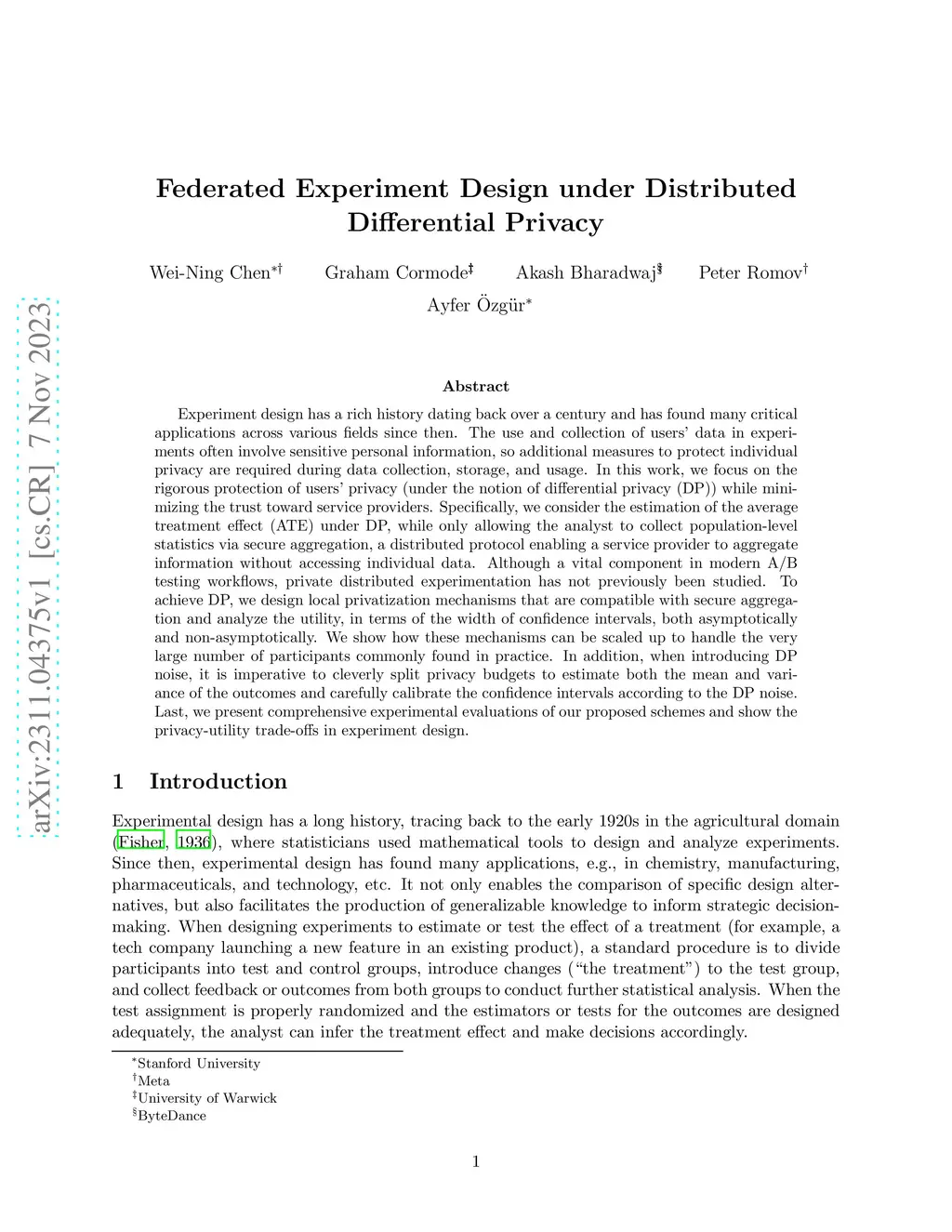 Experiment design has a rich history dating back over a century and has found many critical applications across various fields since then. The use and collection of users' data in experiments often involve sensitive personal information, so additional measures to protect individual privacy are required during data collection, storage, and usage. In this work, we focus on the rigorous protection of users' privacy (under the notion of differential privacy (DP)) while minimizing the trust toward service providers. Specifically, we consider the estimation of the average treatment effect (ATE) under DP, while only allowing the analyst to collect population-level statistics via secure aggregation, a distributed protocol enabling a service provider to aggregate information without accessing individual data. Although a vital component in modern A/B testing workflows, private distributed experimentation has not previously been studied. To achieve DP, we design local privatization mechanisms that are compatible with secure aggregation and analyze the utility, in terms of the width of confidence intervals, both asymptotically and non-asymptotically. We show how these mechanisms can be scaled up to handle the very large number of participants commonly found in practice. In addition, when introducing DP noise, it is imperative to cleverly split privacy budgets to estimate both the mean and variance of the outcomes and carefully calibrate the confidence intervals according to the DP noise. Last, we present comprehensive experimental evaluations of our proposed schemes and show the privacy-utility trade-offs in experiment design.