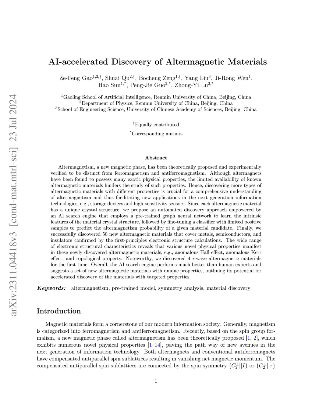 Altermagnetism, a new magnetic phase, has been theoretically proposed and experimentally verified to be distinct from ferromagnetism and antiferromagnetism. Although altermagnets have been found to possess many exotic physical properties, the limited availability of known altermagnetic materials hinders the study of such properties. Hence, discovering more types of altermagnetic materials with different properties is crucial for a comprehensive understanding of altermagnetism and thus facilitating new applications in the next generation information technologies, e.g., storage devices and high-sensitivity sensors. Since each altermagnetic material has a unique crystal structure, we propose an automated discovery approach empowered by an AI search engine that employs a pre-trained graph neural network to learn the intrinsic features of the material crystal structure, followed by fine-tuning a classifier with limited positive samples to predict the altermagnetism probability of a given material candidate. Finally, we successfully discovered 50 new altermagnetic materials that cover metals, semiconductors, and insulators confirmed by the first-principles electronic structure calculations. The wide range of electronic structural characteristics reveals that various novel physical properties manifest in these newly discovered altermagnetic materials, e.g., anomalous Hall effect, anomalous Kerr effect, and topological property. Noteworthy, we discovered 4 -wave altermagnetic materials for the first time. Overall, the AI search engine performs much better than human experts and suggests a set of new altermagnetic materials with unique properties, outlining its potential for accelerated discovery of the materials with targeted properties.