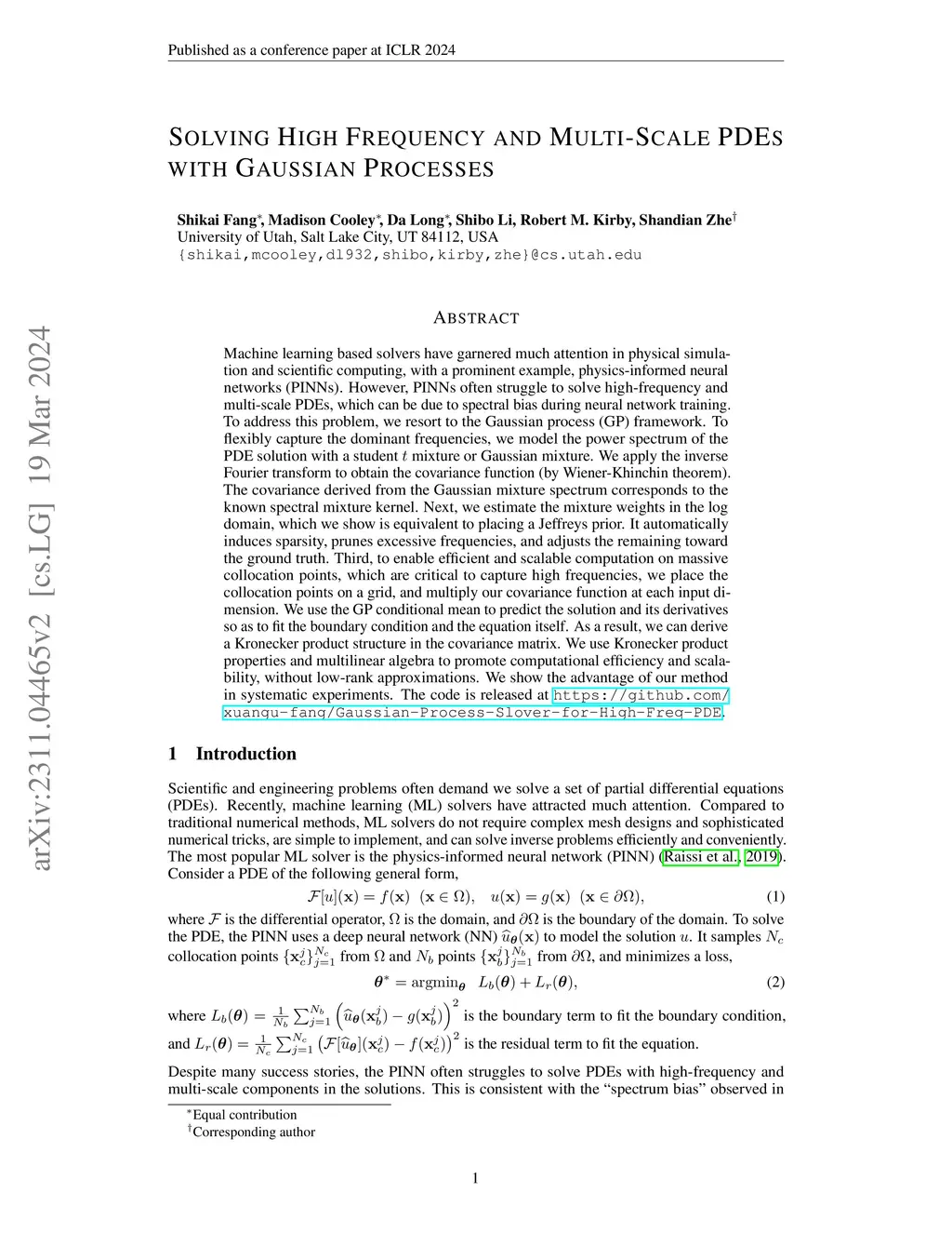 Machine learning based solvers have garnered much attention in physical simulation and scientific computing, with a prominent example, physics-informed neural networks (PINNs). However, PINNs often struggle to solve high-frequency and multi-scale PDEs, which can be due to spectral bias during neural network training. To address this problem, we resort to the Gaussian process (GP) framework. To flexibly capture the dominant frequencies, we model the power spectrum of the PDE solution with a student mixture or Gaussian mixture. We apply the inverse Fourier transform to obtain the covariance function (by Wiener-Khinchin theorem). The covariance derived from the Gaussian mixture spectrum corresponds to the known spectral mixture kernel. Next, we estimate the mixture weights in the log domain, which we show is equivalent to placing a Jeffreys prior. It automatically induces sparsity, prunes excessive frequencies, and adjusts the remaining toward the ground truth. Third, to enable efficient and scalable computation on massive collocation points, which are critical to capture high frequencies, we place the collocation points on a grid, and multiply our covariance function at each input dimension. We use the GP conditional mean to predict the solution and its derivatives so as to fit the boundary condition and the equation itself. As a result, we can derive a Kronecker product structure in the covariance matrix. We use Kronecker product properties and multilinear algebra to promote computational efficiency and scalability, without low-rank approximations. We show the advantage of our method in systematic experiments. The code is released at \url{https://github.com/xuangu-fang/Gaussian-Process-Slover-for-High-Freq-PDE}.