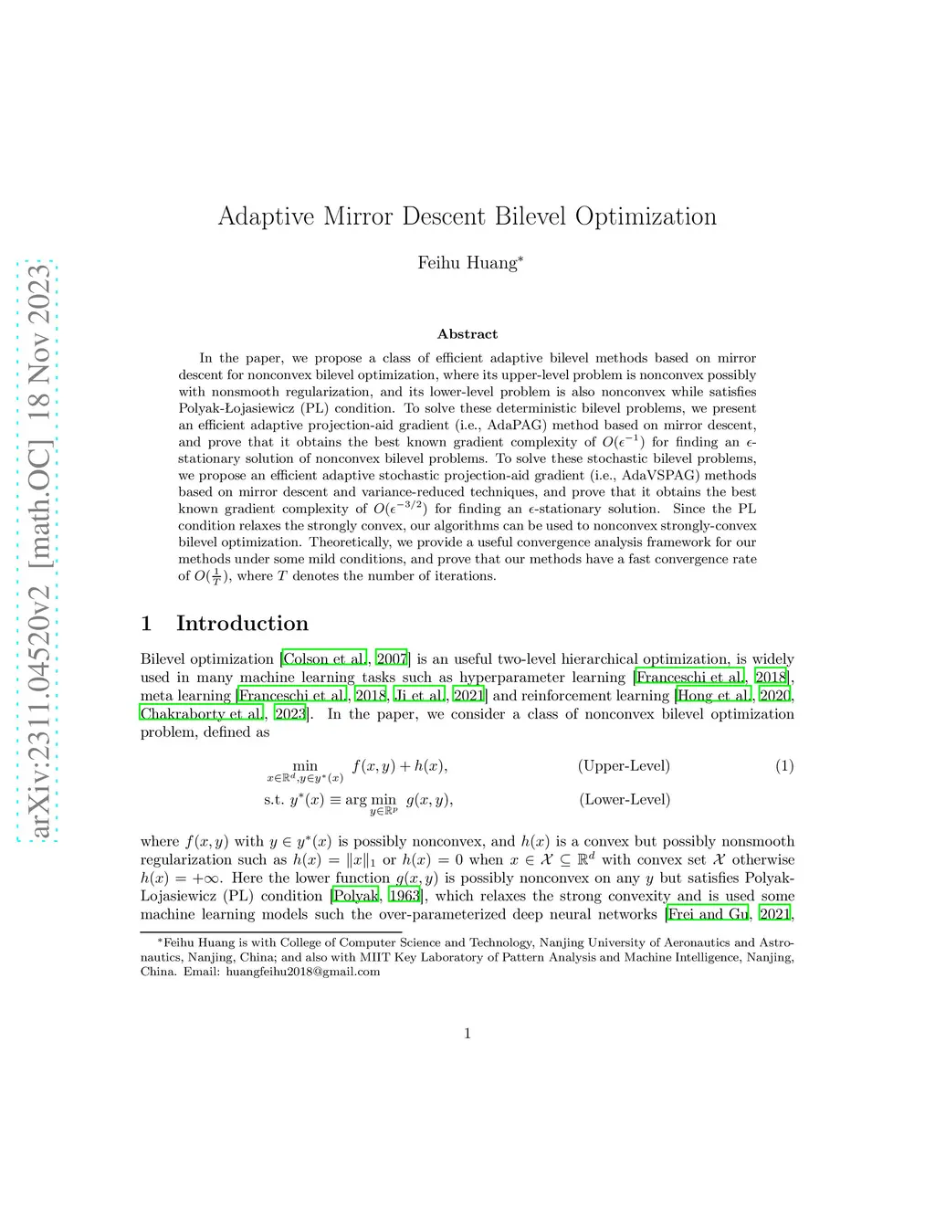 In the paper, we propose a class of efficient adaptive bilevel methods based on mirror descent for nonconvex bilevel optimization, where its upper-level problem is nonconvex possibly with nonsmooth regularization, and its lower-level problem is also nonconvex while satisfies Polyak-{\L}ojasiewicz (PL) condition. To solve these deterministic bilevel problems, we present an efficient adaptive projection-aid gradient (i.e., AdaPAG) method based on mirror descent, and prove that it obtains the best known gradient complexity of for finding an -stationary solution of nonconvex bilevel problems. To solve these stochastic bilevel problems, we propose an efficient adaptive stochastic projection-aid gradient (i.e., AdaVSPAG) methods based on mirror descent and variance-reduced techniques, and prove that it obtains the best known gradient complexity of for finding an -stationary solution. Since the PL condition relaxes the strongly convex, our algorithms can be used to nonconvex strongly-convex bilevel optimization. Theoretically, we provide a useful convergence analysis framework for our methods under some mild conditions, and prove that our methods have a fast convergence rate of , where denotes the number of iterations.
