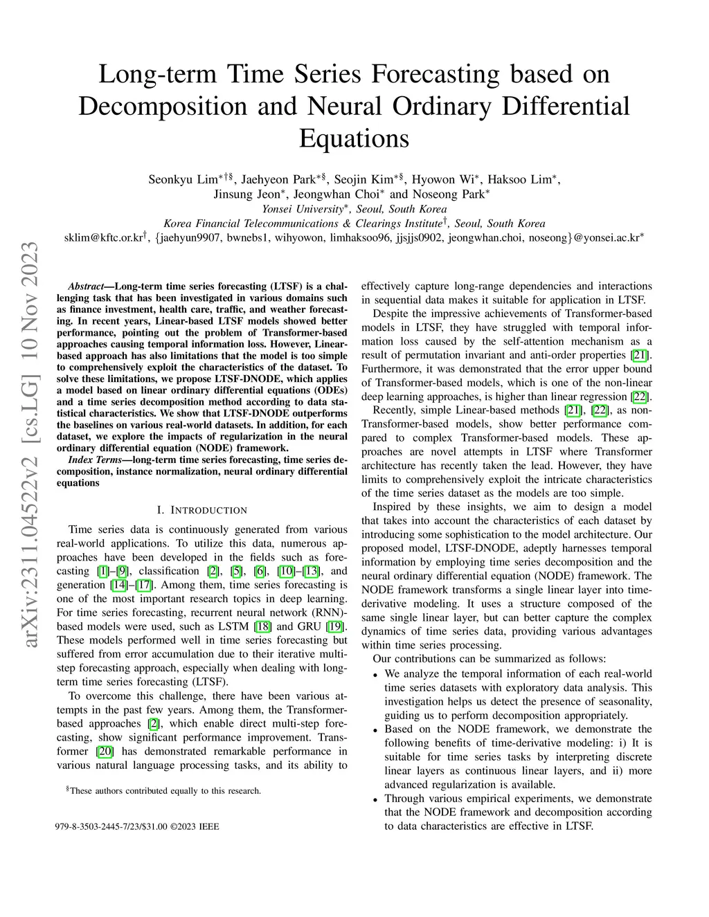 Long-term time series forecasting (LTSF) is a challenging task that has been investigated in various domains such as finance investment, health care, traffic, and weather forecasting. In recent years, Linear-based LTSF models showed better performance, pointing out the problem of Transformer-based approaches causing temporal information loss. However, Linear-based approach has also limitations that the model is too simple to comprehensively exploit the characteristics of the dataset. To solve these limitations, we propose LTSF-DNODE, which applies a model based on linear ordinary differential equations (ODEs) and a time series decomposition method according to data statistical characteristics. We show that LTSF-DNODE outperforms the baselines on various real-world datasets. In addition, for each dataset, we explore the impacts of regularization in the neural ordinary differential equation (NODE) framework.