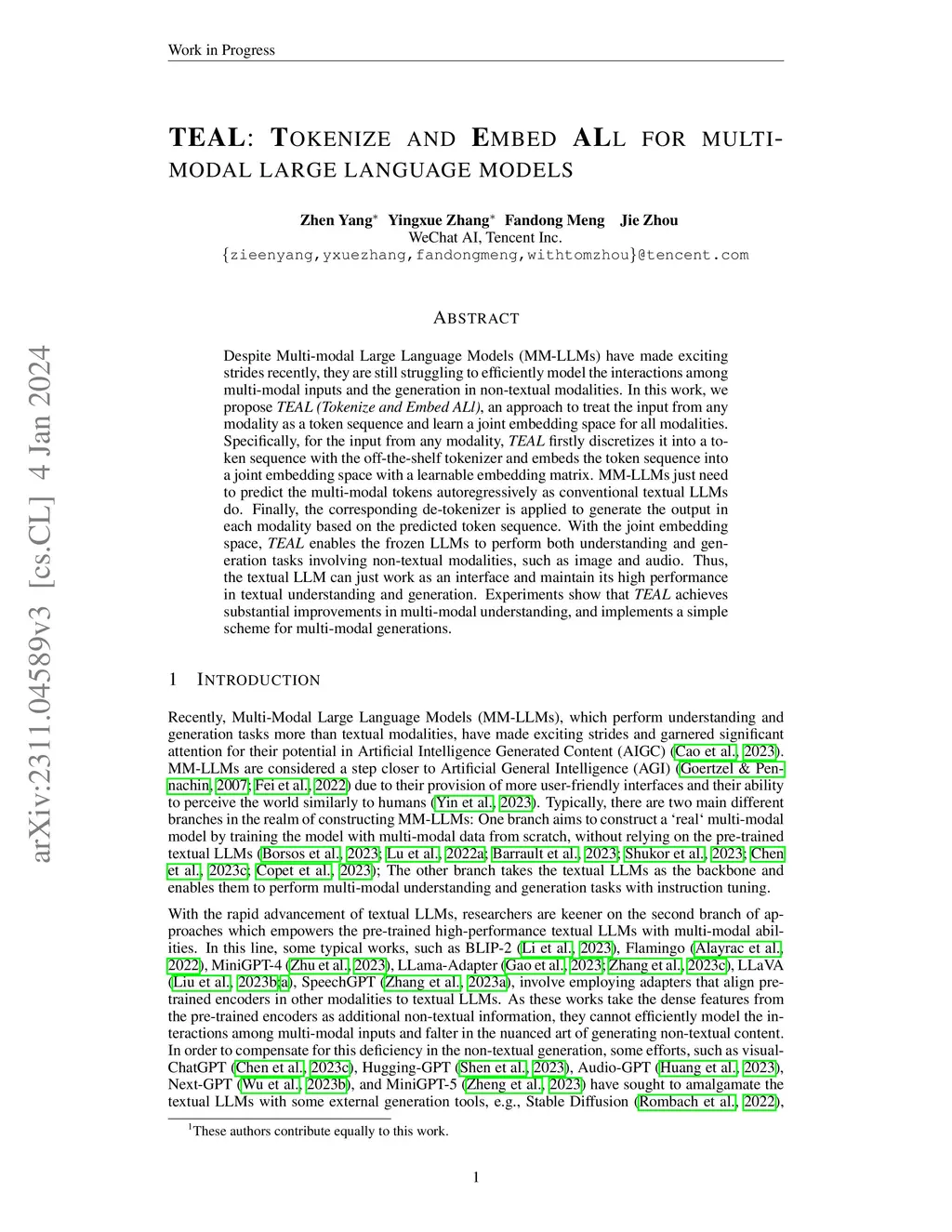 TEAL: Tokenize and Embed ALL for Multi-modal Large Language Models