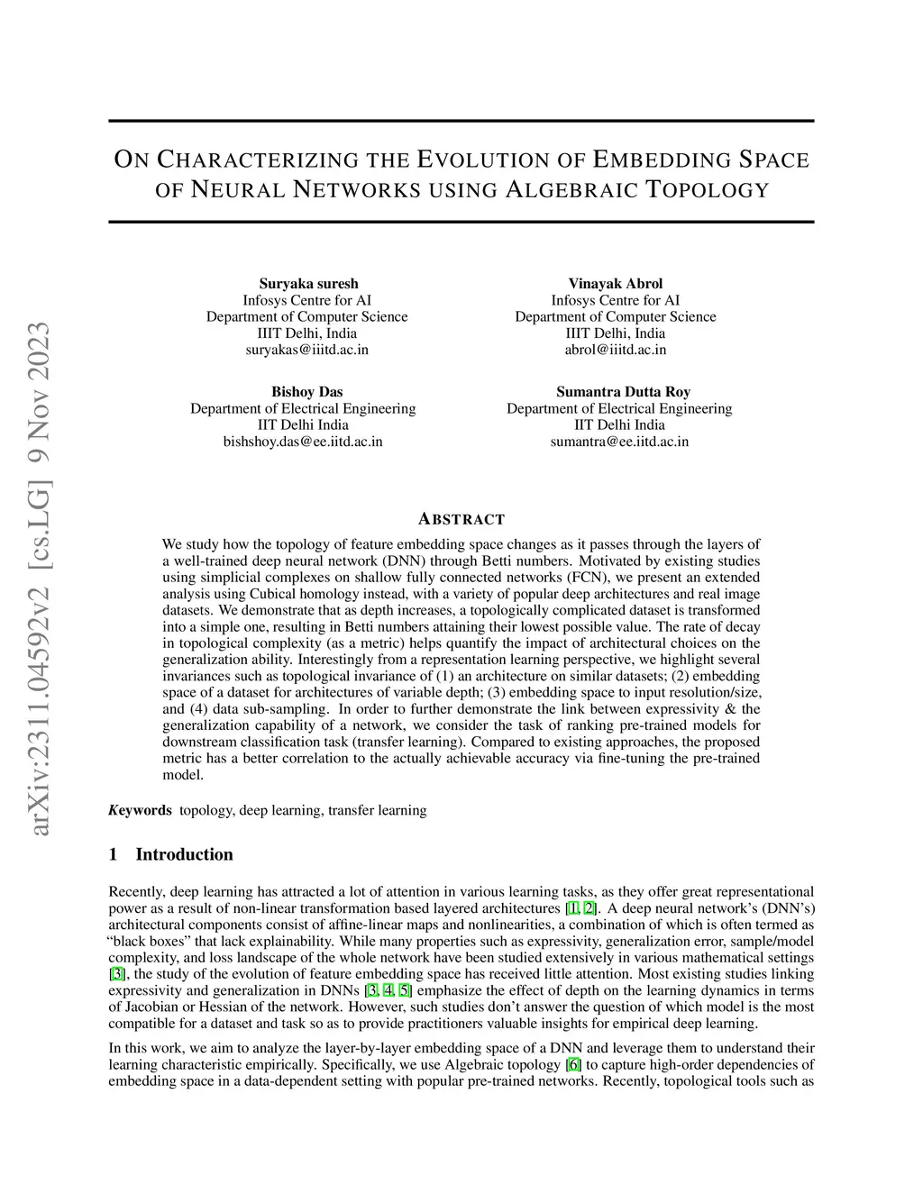 We study how the topology of feature embedding space changes as it passes through the layers of a well-trained deep neural network (DNN) through Betti numbers. Motivated by existing studies using simplicial complexes on shallow fully connected networks (FCN), we present an extended analysis using Cubical homology instead, with a variety of popular deep architectures and real image datasets. We demonstrate that as depth increases, a topologically complicated dataset is transformed into a simple one, resulting in Betti numbers attaining their lowest possible value. The rate of decay in topological complexity (as a metric) helps quantify the impact of architectural choices on the generalization ability. Interestingly from a representation learning perspective, we highlight several invariances such as topological invariance of (1) an architecture on similar datasets; (2) embedding space of a dataset for architectures of variable depth; (3) embedding space to input resolution/size, and (4) data sub-sampling. In order to further demonstrate the link between expressivity \& the generalization capability of a network, we consider the task of ranking pre-trained models for downstream classification task (transfer learning). Compared to existing approaches, the proposed metric has a better correlation to the actually achievable accuracy via fine-tuning the pre-trained model.