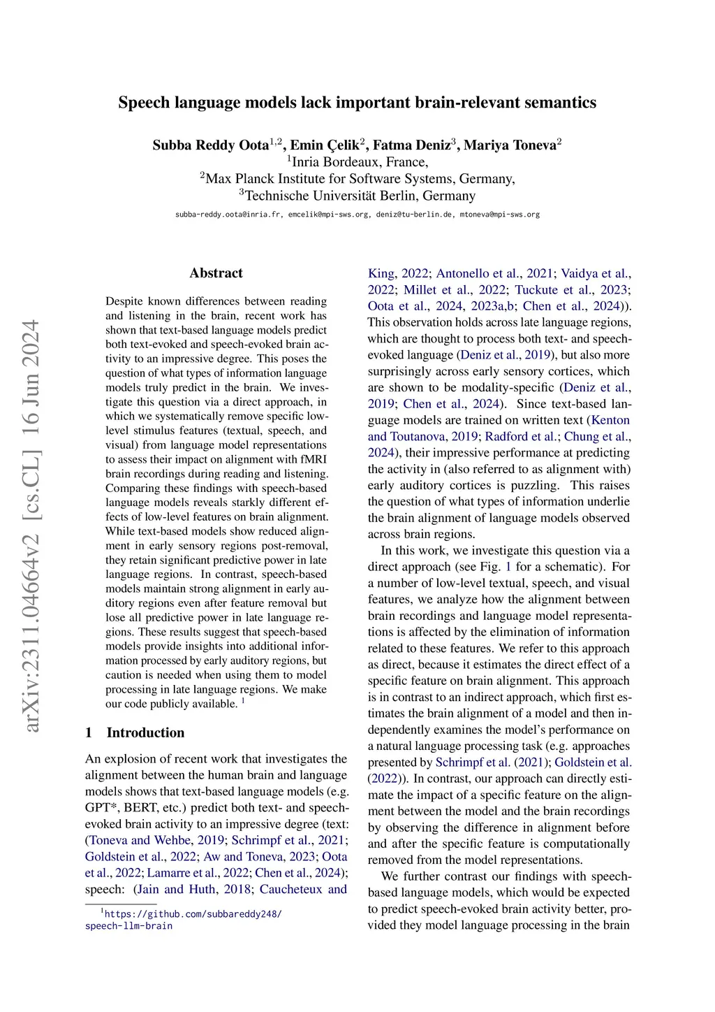 Despite known differences between reading and listening in the brain, recent work has shown that text-based language models predict both text-evoked and speech-evoked brain activity to an impressive degree. This poses the question of what types of information language models truly predict in the brain. We investigate this question via a direct approach, in which we systematically remove specific low-level stimulus features (textual, speech, and visual) from language model representations to assess their impact on alignment with fMRI brain recordings during reading and listening. Comparing these findings with speech-based language models reveals starkly different effects of low-level features on brain alignment. While text-based models show reduced alignment in early sensory regions post-removal, they retain significant predictive power in late language regions. In contrast, speech-based models maintain strong alignment in early auditory regions even after feature removal but lose all predictive power in late language regions. These results suggest that speech-based models provide insights into additional information processed by early auditory regions, but caution is needed when using them to model processing in late language regions. We make our code publicly available. [https://github.com/subbareddy248/speech-llm-brain]