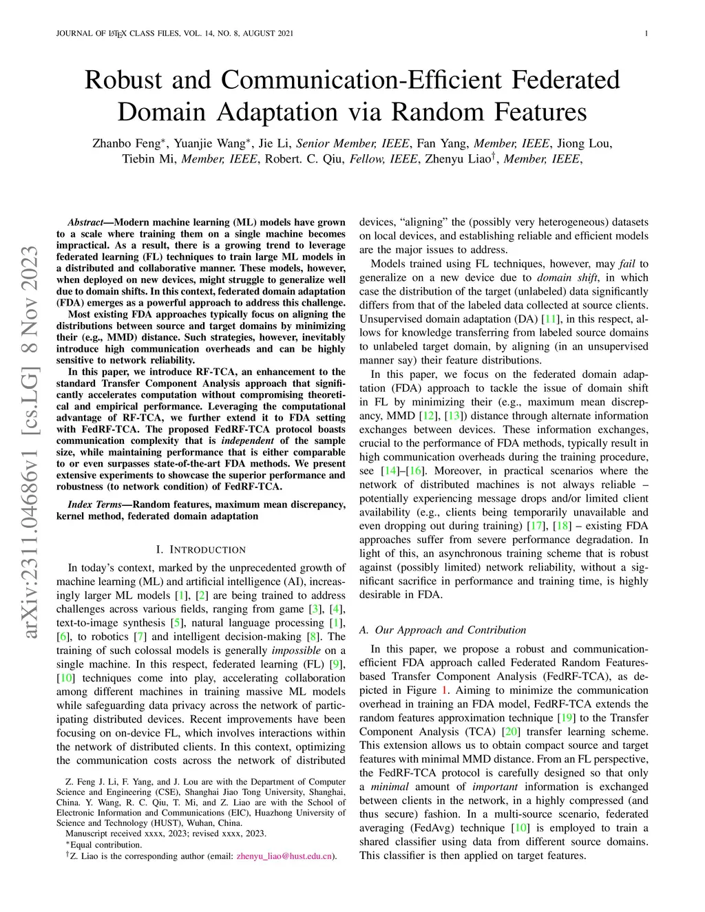 Modern machine learning (ML) models have grown to a scale where training them on a single machine becomes impractical. As a result, there is a growing trend to leverage federated learning (FL) techniques to train large ML models in a distributed and collaborative manner. These models, however, when deployed on new devices, might struggle to generalize well due to domain shifts. In this context, federated domain adaptation (FDA) emerges as a powerful approach to address this challenge. Most existing FDA approaches typically focus on aligning the distributions between source and target domains by minimizing their (e.g., MMD) distance. Such strategies, however, inevitably introduce high communication overheads and can be highly sensitive to network reliability. In this paper, we introduce RF-TCA, an enhancement to the standard Transfer Component Analysis approach that significantly accelerates computation without compromising theoretical and empirical performance. Leveraging the computational advantage of RF-TCA, we further extend it to FDA setting with FedRF-TCA. The proposed FedRF-TCA protocol boasts communication complexity that is \emph{independent} of the sample size, while maintaining performance that is either comparable to or even surpasses state-of-the-art FDA methods. We present extensive experiments to showcase the superior performance and robustness (to network condition) of FedRF-TCA.