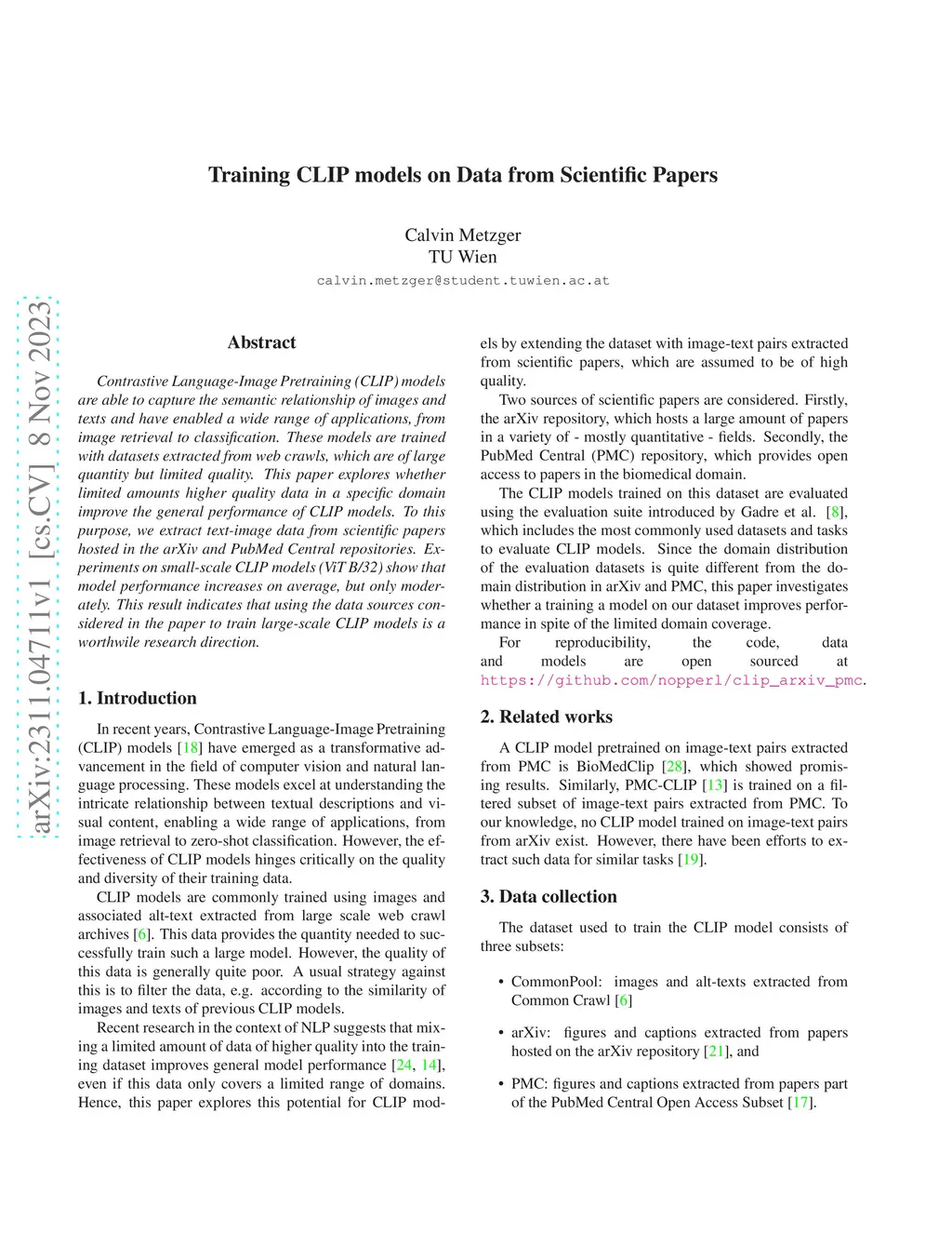 Contrastive Language-Image Pretraining (CLIP) models are able to capture the semantic relationship of images and texts and have enabled a wide range of applications, from image retrieval to classification. These models are trained with datasets extracted from web crawls, which are of large quantity but limited quality. This paper explores whether limited amounts higher quality data in a specific domain improve the general performance of CLIP models. To this purpose, we extract text-image data from scientific papers hosted in the arXiv and PubMed Central repositories. Experiments on small-scale CLIP models (ViT B/32) show that model performance increases on average, but only moderately. This result indicates that using the data sources considered in the paper to train large-scale CLIP models is a worthwile research direction.