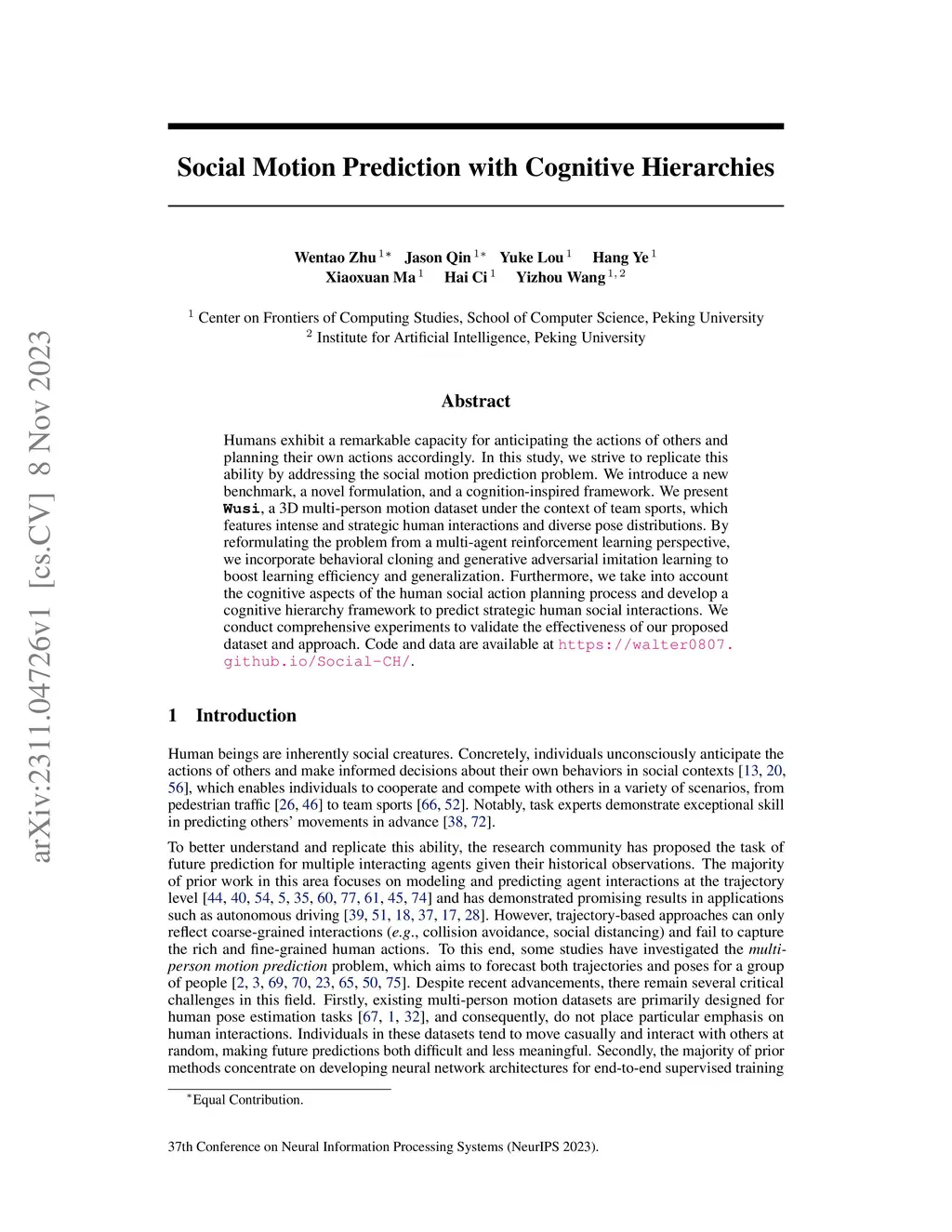 Humans exhibit a remarkable capacity for anticipating the actions of others and planning their own actions accordingly. In this study, we strive to replicate this ability by addressing the social motion prediction problem. We introduce a new benchmark, a novel formulation, and a cognition-inspired framework. We present Wusi, a 3D multi-person motion dataset under the context of team sports, which features intense and strategic human interactions and diverse pose distributions. By reformulating the problem from a multi-agent reinforcement learning perspective, we incorporate behavioral cloning and generative adversarial imitation learning to boost learning efficiency and generalization. Furthermore, we take into account the cognitive aspects of the human social action planning process and develop a cognitive hierarchy framework to predict strategic human social interactions. We conduct comprehensive experiments to validate the effectiveness of our proposed dataset and approach. Code and data are available at https://walter0807.github.io/Social-CH/.