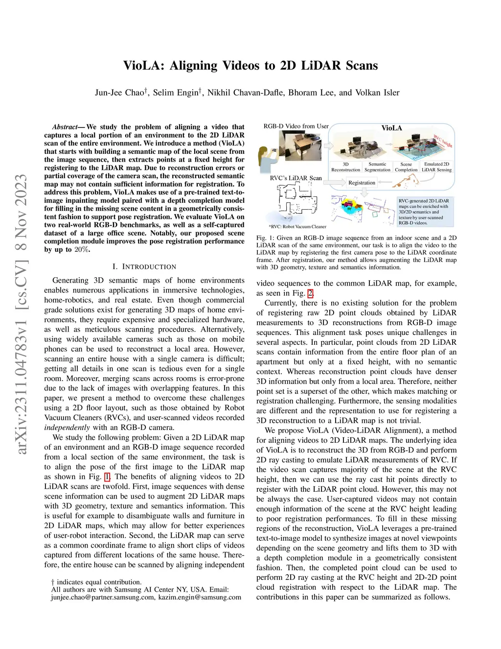 We study the problem of aligning a video that captures a local portion of an environment to the 2D LiDAR scan of the entire environment. We introduce a method (VioLA) that starts with building a semantic map of the local scene from the image sequence, then extracts points at a fixed height for registering to the LiDAR map. Due to reconstruction errors or partial coverage of the camera scan, the reconstructed semantic map may not contain sufficient information for registration. To address this problem, VioLA makes use of a pre-trained text-to-image inpainting model paired with a depth completion model for filling in the missing scene content in a geometrically consistent fashion to support pose registration. We evaluate VioLA on two real-world RGB-D benchmarks, as well as a self-captured dataset of a large office scene. Notably, our proposed scene completion module improves the pose registration performance by up to 20%.