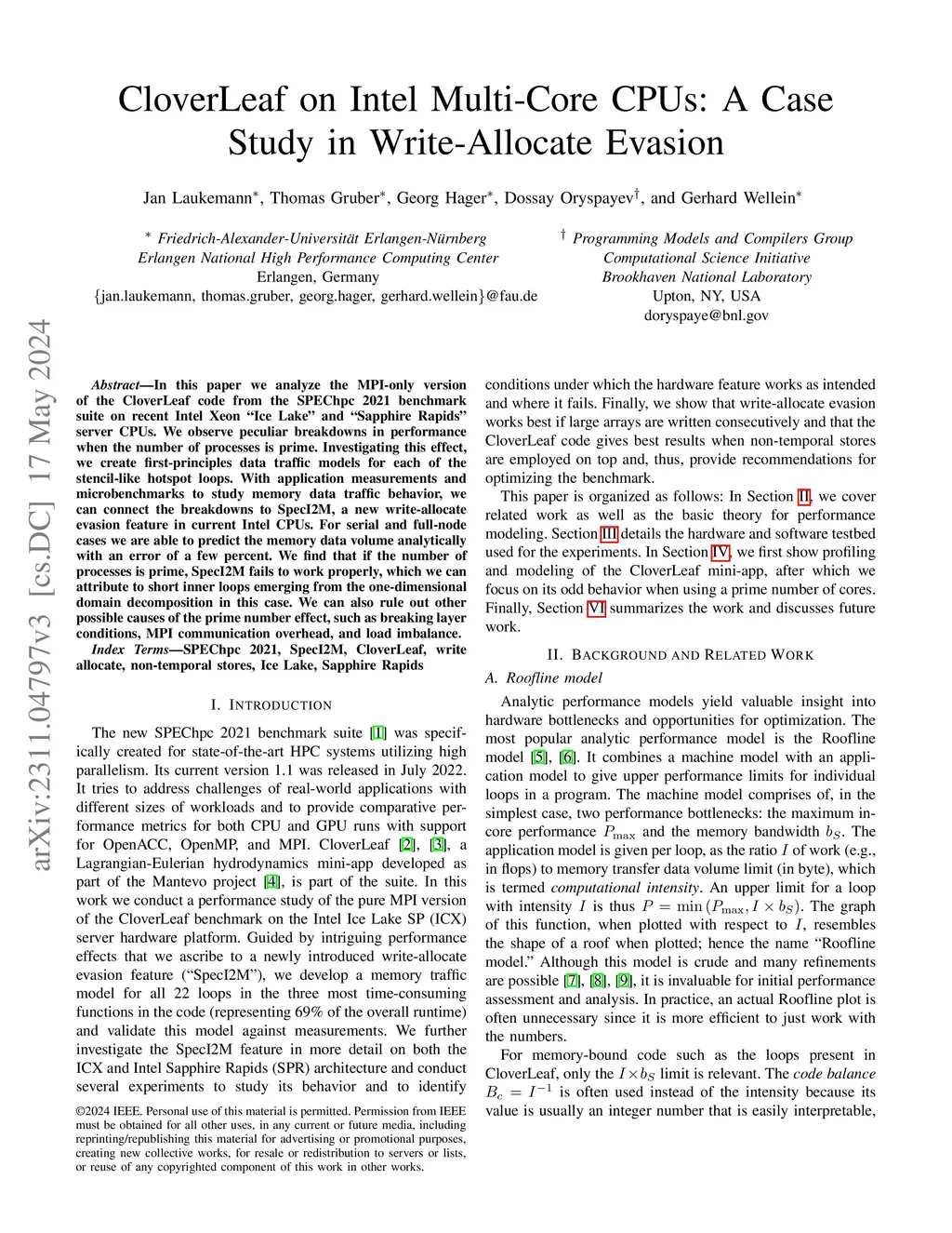 In this paper we analyze the MPI-only version of the CloverLeaf code from the SPEChpc 2021 benchmark suite on recent Intel Xeon "Ice Lake" and "Sapphire Rapids" server CPUs. We observe peculiar breakdowns in performance when the number of processes is prime. Investigating this effect, we create first-principles data traffic models for each of the stencil-like hotspot loops. With application measurements and microbenchmarks to study memory data traffic behavior, we can connect the breakdowns to SpecI2M, a new write-allocate evasion feature in current Intel CPUs. For serial and full-node cases we are able to predict the memory data volume analytically with an error of a few percent. We find that if the number of processes is prime, SpecI2M fails to work properly, which we can attribute to short inner loops emerging from the one-dimensional domain decomposition in this case. We can also rule out other possible causes of the prime number effect, such as breaking layer conditions, MPI communication overhead, and load imbalance.