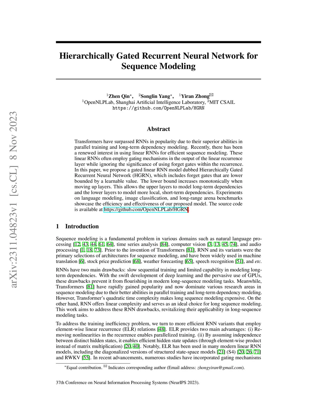 Transformers have surpassed RNNs in popularity due to their superior abilities in parallel training and long-term dependency modeling. Recently, there has been a renewed interest in using linear RNNs for efficient sequence modeling. These linear RNNs often employ gating mechanisms in the output of the linear recurrence layer while ignoring the significance of using forget gates within the recurrence. In this paper, we propose a gated linear RNN model dubbed Hierarchically Gated Recurrent Neural Network (HGRN), which includes forget gates that are lower bounded by a learnable value. The lower bound increases monotonically when moving up layers. This allows the upper layers to model long-term dependencies and the lower layers to model more local, short-term dependencies. Experiments on language modeling, image classification, and long-range arena benchmarks showcase the efficiency and effectiveness of our proposed model. The source code is available at https://github.com/OpenNLPLab/HGRN.