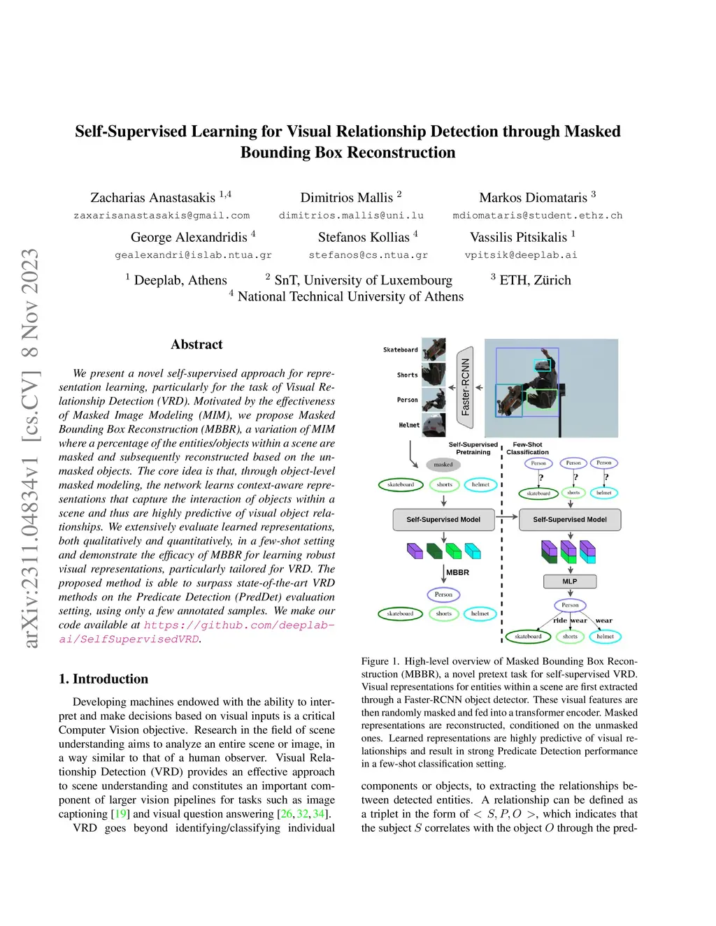 We present a novel self-supervised approach for representation learning, particularly for the task of Visual Relationship Detection (VRD). Motivated by the effectiveness of Masked Image Modeling (MIM), we propose Masked Bounding Box Reconstruction (MBBR), a variation of MIM where a percentage of the entities/objects within a scene are masked and subsequently reconstructed based on the unmasked objects. The core idea is that, through object-level masked modeling, the network learns context-aware representations that capture the interaction of objects within a scene and thus are highly predictive of visual object relationships. We extensively evaluate learned representations, both qualitatively and quantitatively, in a few-shot setting and demonstrate the efficacy of MBBR for learning robust visual representations, particularly tailored for VRD. The proposed method is able to surpass state-of-the-art VRD methods on the Predicate Detection (PredDet) evaluation setting, using only a few annotated samples. We make our code available at https://github.com/deeplab-ai/SelfSupervisedVRD.