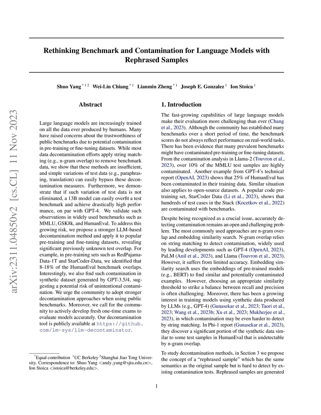 Large language models are increasingly trained on all the data ever produced by humans. Many have raised concerns about the trustworthiness of public benchmarks due to potential contamination in pre-training or fine-tuning datasets. While most data decontamination efforts apply string matching (e.g., n-gram overlap) to remove benchmark data, we show that these methods are insufficient, and simple variations of test data (e.g., paraphrasing, translation) can easily bypass these decontamination measures. Furthermore, we demonstrate that if such variation of test data is not eliminated, a 13B model can easily overfit a test benchmark and achieve drastically high performance, on par with GPT-4. We validate such observations in widely used benchmarks such as MMLU, GSK8k, and HumanEval. To address this growing risk, we propose a stronger LLM-based decontamination method and apply it to widely used pre-training and fine-tuning datasets, revealing significant previously unknown test overlap. For example, in pre-training sets such as RedPajama-Data-1T and StarCoder-Data, we identified that 8-18\% of the HumanEval benchmark overlaps. Interestingly, we also find such contamination in synthetic dataset generated by GPT-3.5/4, suggesting a potential risk of unintentional contamination. We urge the community to adopt stronger decontamination approaches when using public benchmarks. Moreover, we call for the community to actively develop fresh one-time exams to evaluate models accurately. Our decontamination tool is publicly available at https://github.com/lm-sys/llm-decontaminator.