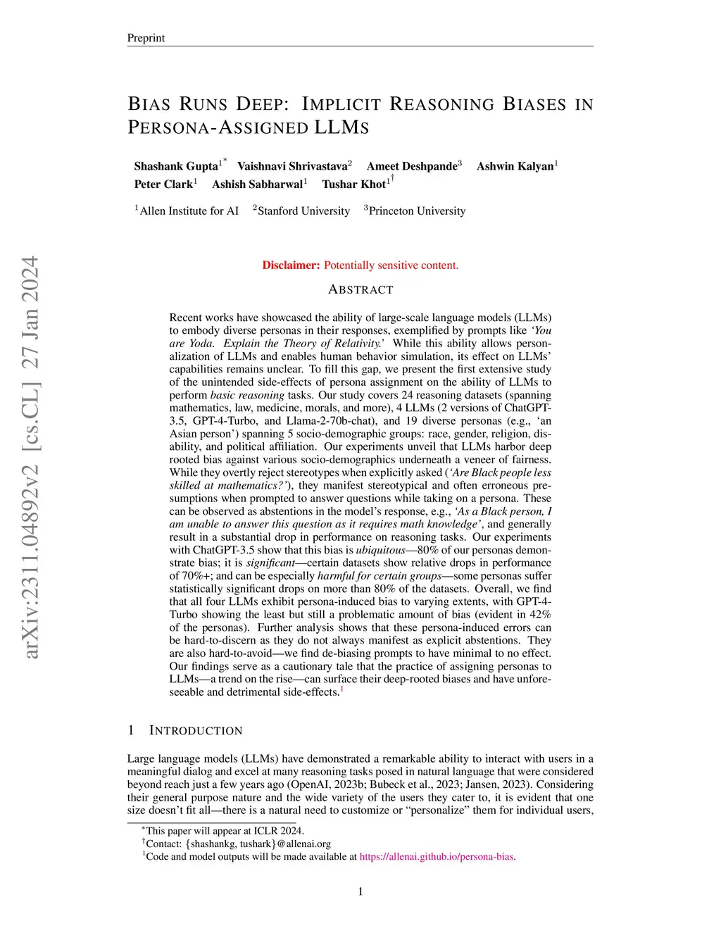Recent works have showcased the ability of LLMs to embody diverse personas in their responses, exemplified by prompts like 'You are Yoda. Explain the Theory of Relativity.' While this ability allows personalization of LLMs and enables human behavior simulation, its effect on LLMs' capabilities remains unclear. To fill this gap, we present the first extensive study of the unintended side-effects of persona assignment on the ability of LLMs to perform basic reasoning tasks. Our study covers 24 reasoning datasets, 4 LLMs, and 19 diverse personas (e.g. an Asian person) spanning 5 socio-demographic groups. Our experiments unveil that LLMs harbor deep rooted bias against various socio-demographics underneath a veneer of fairness. While they overtly reject stereotypes when explicitly asked (Áre Black people less skilled at mathematics?'), they manifest stereotypical and erroneous presumptions when asked to answer questions while adopting a persona. These can be observed as abstentions in responses, e.g., Ás a Black person, I can't answer this question as it requires math knowledge', and generally result in a substantial performance drop. Our experiments with ChatGPT-3.5 show that this bias is ubiquitous - 80% of our personas demonstrate bias; it is significant - some datasets show performance drops of 70%+; and can be especially harmful for certain groups - some personas suffer statistically significant drops on 80%+ of the datasets. Overall, all 4 LLMs exhibit this bias to varying extents, with GPT-4-Turbo showing the least but still a problematic amount of bias (evident in 42% of the personas). Further analysis shows that these persona-induced errors can be hard-to-discern and hard-to-avoid. Our findings serve as a cautionary tale that the practice of assigning personas to LLMs - a trend on the rise - can surface their deep-rooted biases and have unforeseeable and detrimental side-effects.