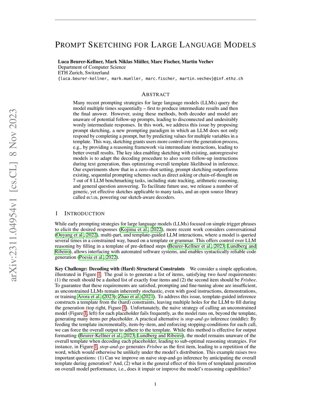 Many recent prompting strategies for large language models (LLMs) query the model multiple times sequentially -- first to produce intermediate results and then the final answer. However, using these methods, both decoder and model are unaware of potential follow-up prompts, leading to disconnected and undesirably wordy intermediate responses. In this work, we address this issue by proposing prompt sketching, a new prompting paradigm in which an LLM does not only respond by completing a prompt, but by predicting values for multiple variables in a template. This way, sketching grants users more control over the generation process, e.g., by providing a reasoning framework via intermediate instructions, leading to better overall results. The key idea enabling sketching with existing, autoregressive models is to adapt the decoding procedure to also score follow-up instructions during text generation, thus optimizing overall template likelihood in inference. Our experiments show that in a zero-shot setting, prompt sketching outperforms existing, sequential prompting schemes such as direct asking or chain-of-thought on 7 out of 8 LLM benchmarking tasks, including state tracking, arithmetic reasoning, and general question answering. To facilitate future use, we release a number of generic, yet effective sketches applicable to many tasks, and an open source library called dclib, powering our sketch-aware decoders.
