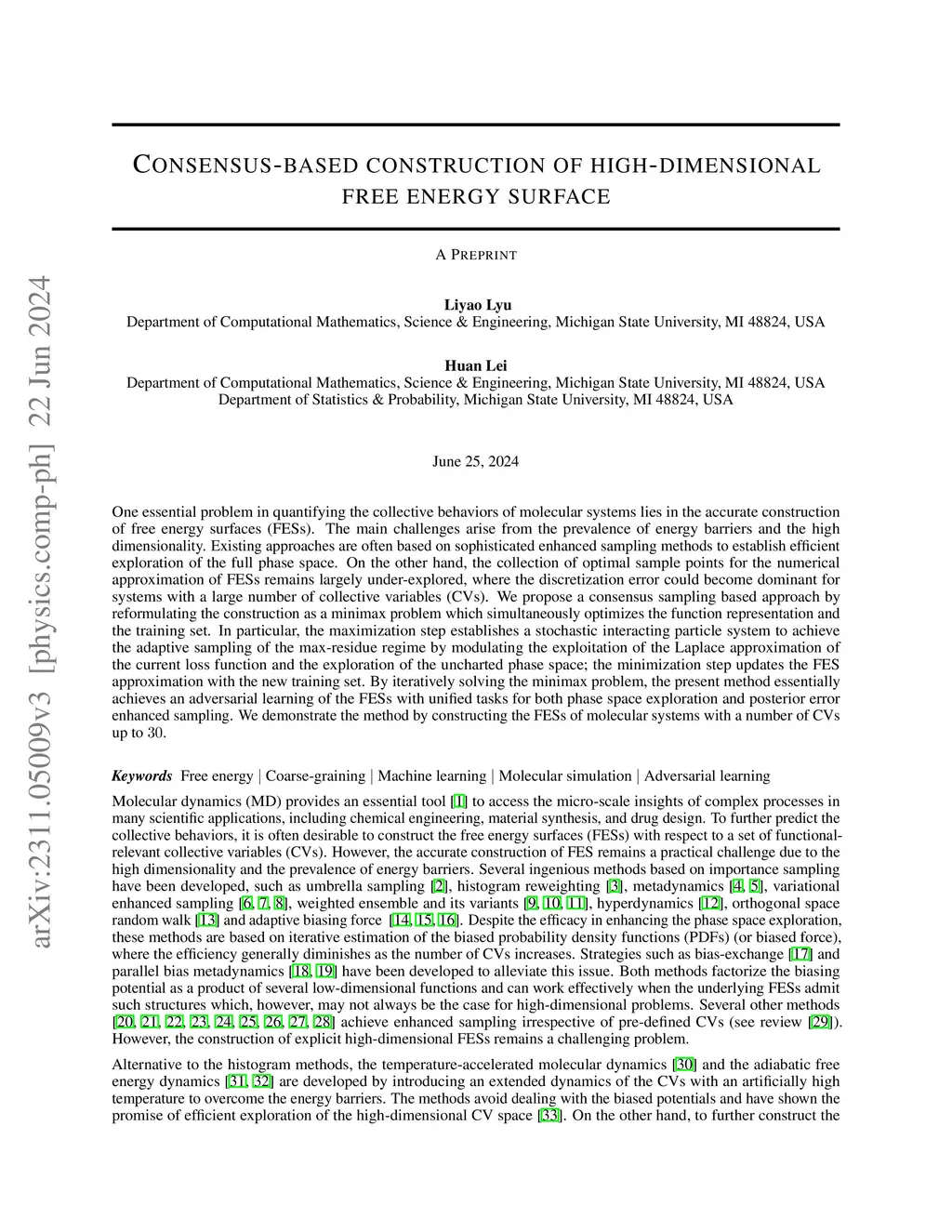 We present a consensus-based framework that unifies phase space exploration with posterior-residual-based adaptive sampling for surrogate construction in high-dimensional energy landscapes. Unlike standard approximation tasks where sampling points can be freely queried, physical systems with complex energy landscapes such as molecular dynamics (MD) do not have direct access to arbitrary sampling regions due to the physical constraints and energy barriers; the surrogate construction further relies on the dynamical exploration of phase space, posing a significant numerical challenge. We formulate the problem as a minimax optimization that jointly adapts both the surrogate approximation and residual-enhanced sampling. The construction of free energy surfaces (FESs) for high-dimensional collective variables (CVs) of MD systems is used as a motivating example to illustrate the essential idea. Specifically, the maximization step establishes a stochastic interacting particle system to impose adaptive sampling through both exploitation of a Laplace approximation of the max-residual region and exploration of uncharted phase space via temperature control. The minimization step updates the FES surrogate with the new sample set. Numerical results demonstrate the effectiveness of the present approach for biomolecular systems with up to 30 CVs. While we focus on the FES construction, the developed framework is general for efficient surrogate construction for complex systems with high-dimensional energy landscapes.