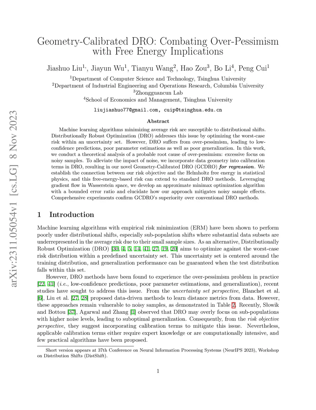 Machine learning algorithms minimizing average risk are susceptible to distributional shifts. Distributionally Robust Optimization (DRO) addresses this issue by optimizing the worst-case risk within an uncertainty set. However, DRO suffers from over-pessimism, leading to low-confidence predictions, poor parameter estimations as well as poor generalization. In this work, we conduct a theoretical analysis of a probable root cause of over-pessimism: excessive focus on noisy samples. To alleviate the impact of noise, we incorporate data geometry into calibration terms in DRO, resulting in our novel Geometry-Calibrated DRO (GCDRO) for regression. We establish the connection between our risk objective and the Helmholtz free energy in statistical physics, and this free-energy-based risk can extend to standard DRO methods. Leveraging gradient flow in Wasserstein space, we develop an approximate minimax optimization algorithm with a bounded error ratio and elucidate how our approach mitigates noisy sample effects. Comprehensive experiments confirm GCDRO's superiority over conventional DRO methods.