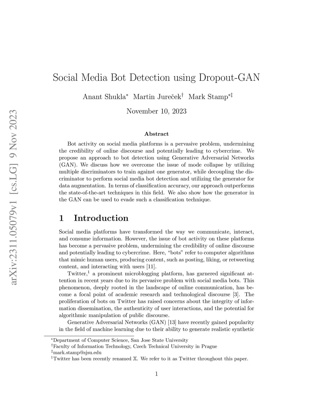 Bot activity on social media platforms is a pervasive problem, undermining the credibility of online discourse and potentially leading to cybercrime. We propose an approach to bot detection using Generative Adversarial Networks (GAN). We discuss how we overcome the issue of mode collapse by utilizing multiple discriminators to train against one generator, while decoupling the discriminator to perform social media bot detection and utilizing the generator for data augmentation. In terms of classification accuracy, our approach outperforms the state-of-the-art techniques in this field. We also show how the generator in the GAN can be used to evade such a classification technique.