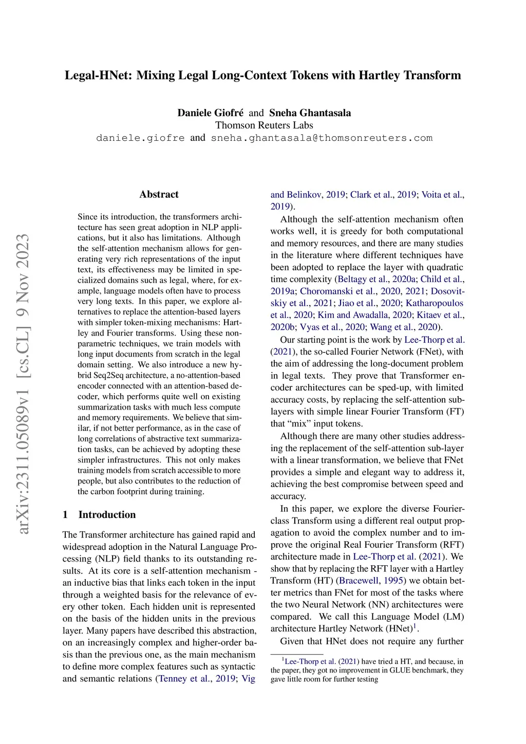 Since its introduction, the transformers architecture has seen great adoption in NLP applications, but it also has limitations. Although the self-attention mechanism allows for generating very rich representations of the input text, its effectiveness may be limited in specialized domains such as legal, where, for example, language models often have to process very long texts. In this paper, we explore alternatives to replace the attention-based layers with simpler token-mixing mechanisms: Hartley and Fourier transforms. Using these non-parametric techniques, we train models with long input documents from scratch in the legal domain setting. We also introduce a new hybrid Seq2Seq architecture, a no-attention-based encoder connected with an attention-based decoder, which performs quite well on existing summarization tasks with much less compute and memory requirements. We believe that similar, if not better performance, as in the case of long correlations of abstractive text summarization tasks, can be achieved by adopting these simpler infrastructures. This not only makes training models from scratch accessible to more people, but also contributes to the reduction of the carbon footprint during training.