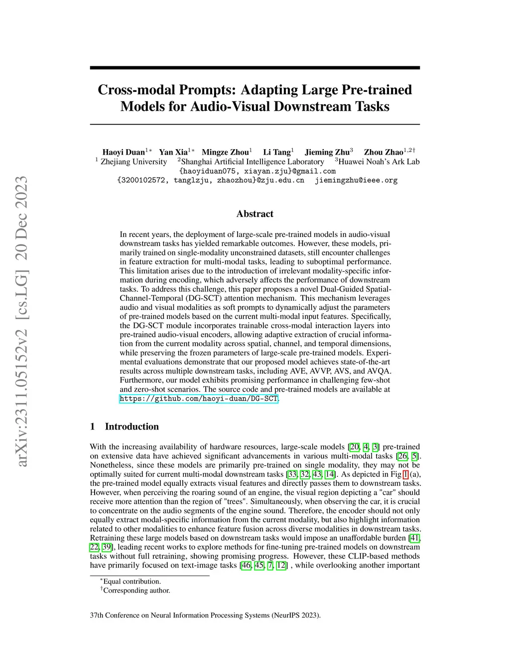 In recent years, the deployment of large-scale pre-trained models in audio-visual downstream tasks has yielded remarkable outcomes. However, these models, primarily trained on single-modality unconstrained datasets, still encounter challenges in feature extraction for multi-modal tasks, leading to suboptimal performance. This limitation arises due to the introduction of irrelevant modality-specific information during encoding, which adversely affects the performance of downstream tasks. To address this challenge, this paper proposes a novel Dual-Guided Spatial-Channel-Temporal (DG-SCT) attention mechanism. This mechanism leverages audio and visual modalities as soft prompts to dynamically adjust the parameters of pre-trained models based on the current multi-modal input features. Specifically, the DG-SCT module incorporates trainable cross-modal interaction layers into pre-trained audio-visual encoders, allowing adaptive extraction of crucial information from the current modality across spatial, channel, and temporal dimensions, while preserving the frozen parameters of large-scale pre-trained models. Experimental evaluations demonstrate that our proposed model achieves state-of-the-art results across multiple downstream tasks, including AVE, AVVP, AVS, and AVQA. Furthermore, our model exhibits promising performance in challenging few-shot and zero-shot scenarios. The source code and pre-trained models are available at https://github.com/haoyi-duan/DG-SCT.