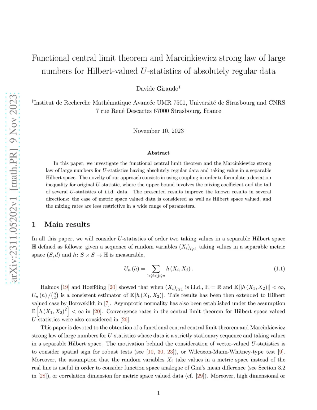 In this paper, we investigate the functional central limit theorem and the Marcinkiewicz strong law of large numbers for U-statistics having absolutely regular data and taking value in a separable Hilbert space. The novelty of our approach consists in using coupling in order to formulate a deviation inequality for original -statistic, where the upper bound involves the mixing coefficient and the tail of several U-statistics of i.i.d. data. The presented results improve the known results in several directions: the case of metric space valued data is considered as well as Hilbert space valued, and the mixing rates are less restrictive in a wide range of parameters.