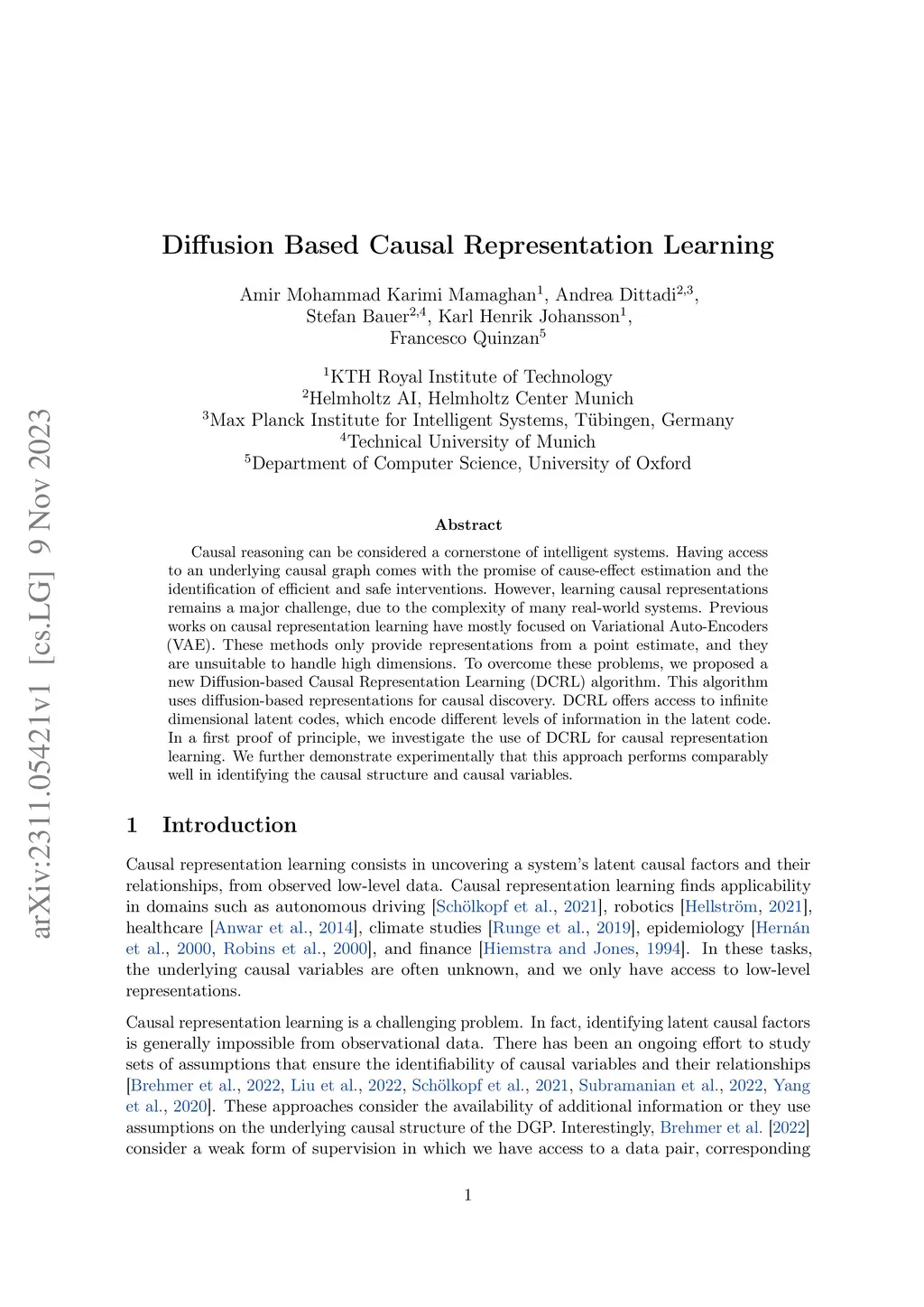 Causal reasoning can be considered a cornerstone of intelligent systems. Having access to an underlying causal graph comes with the promise of cause-effect estimation and the identification of efficient and safe interventions. However, learning causal representations remains a major challenge, due to the complexity of many real-world systems. Previous works on causal representation learning have mostly focused on Variational Auto-Encoders (VAE). These methods only provide representations from a point estimate, and they are unsuitable to handle high dimensions. To overcome these problems, we proposed a new Diffusion-based Causal Representation Learning (DCRL) algorithm. This algorithm uses diffusion-based representations for causal discovery. DCRL offers access to infinite dimensional latent codes, which encode different levels of information in the latent code. In a first proof of principle, we investigate the use of DCRL for causal representation learning. We further demonstrate experimentally that this approach performs comparably well in identifying the causal structure and causal variables.