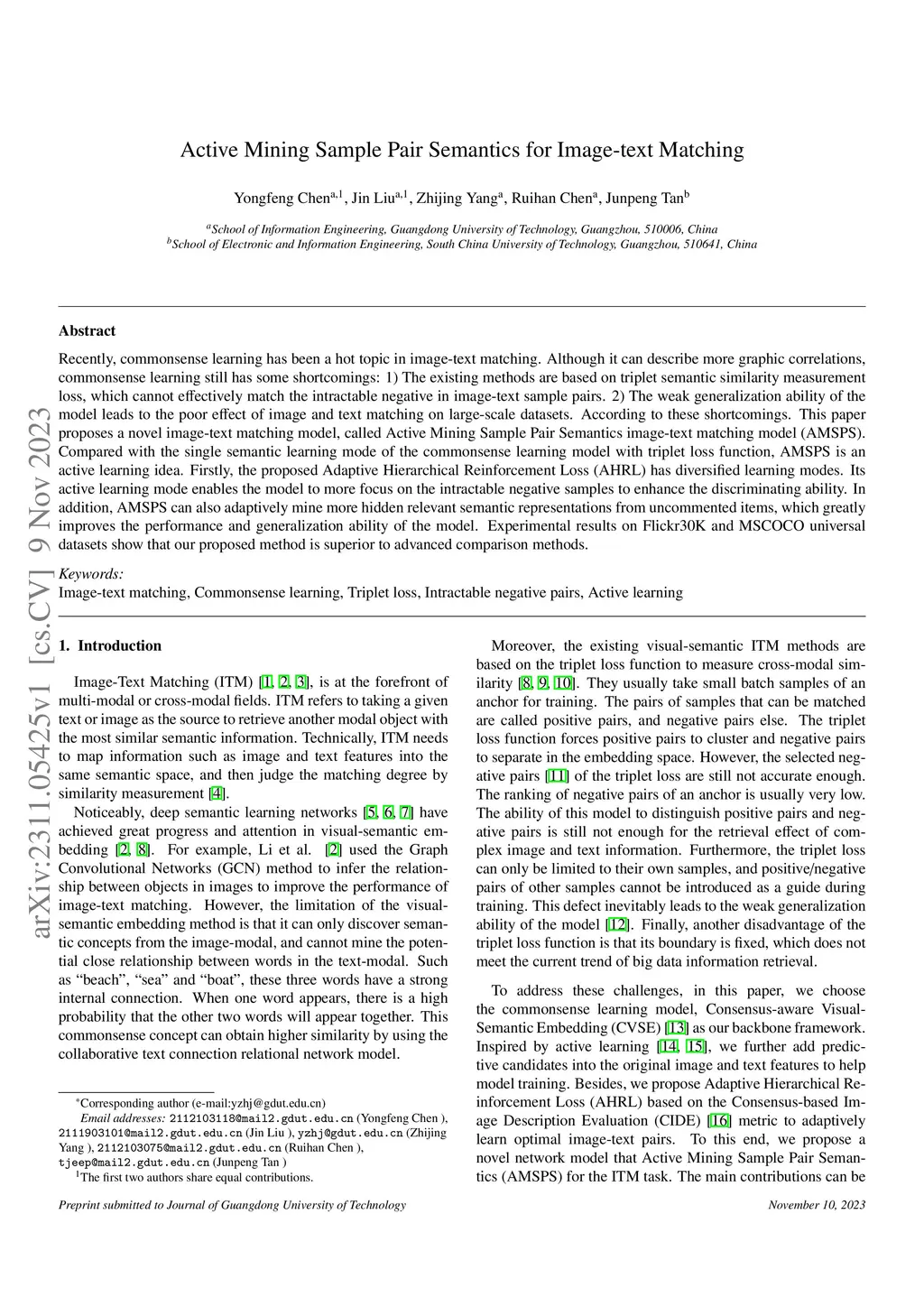 Recently, commonsense learning has been a hot topic in image-text matching. Although it can describe more graphic correlations, commonsense learning still has some shortcomings: 1) The existing methods are based on triplet semantic similarity measurement loss, which cannot effectively match the intractable negative in image-text sample pairs. 2) The weak generalization ability of the model leads to the poor effect of image and text matching on large-scale datasets. According to these shortcomings. This paper proposes a novel image-text matching model, called Active Mining Sample Pair Semantics image-text matching model (AMSPS). Compared with the single semantic learning mode of the commonsense learning model with triplet loss function, AMSPS is an active learning idea. Firstly, the proposed Adaptive Hierarchical Reinforcement Loss (AHRL) has diversified learning modes. Its active learning mode enables the model to more focus on the intractable negative samples to enhance the discriminating ability. In addition, AMSPS can also adaptively mine more hidden relevant semantic representations from uncommented items, which greatly improves the performance and generalization ability of the model. Experimental results on Flickr30K and MSCOCO universal datasets show that our proposed method is superior to advanced comparison methods.