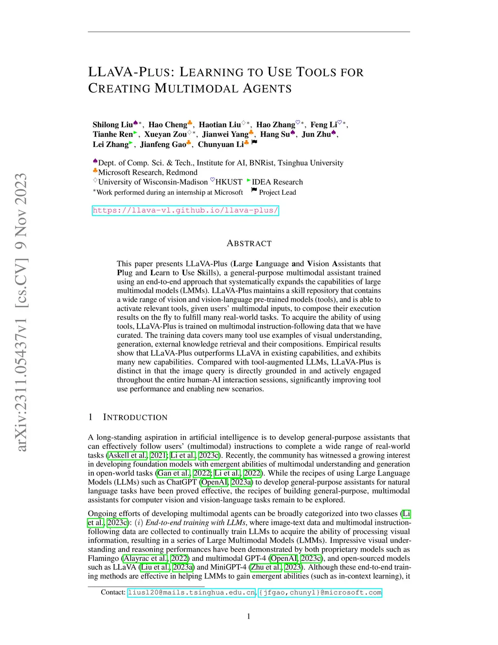 LLaVA-Plus is a general-purpose multimodal assistant that expands the capabilities of large multimodal models. It maintains a skill repository of pre-trained vision and vision-language models and can activate relevant tools based on users' inputs to fulfill real-world tasks. LLaVA-Plus is trained on multimodal instruction-following data to acquire the ability to use tools, covering visual understanding, generation, external knowledge retrieval, and compositions. Empirical results show that LLaVA-Plus outperforms LLaVA in existing capabilities and exhibits new ones. It is distinct in that the image query is directly grounded and actively engaged throughout the entire human-AI interaction sessions, significantly improving tool use performance and enabling new scenarios.