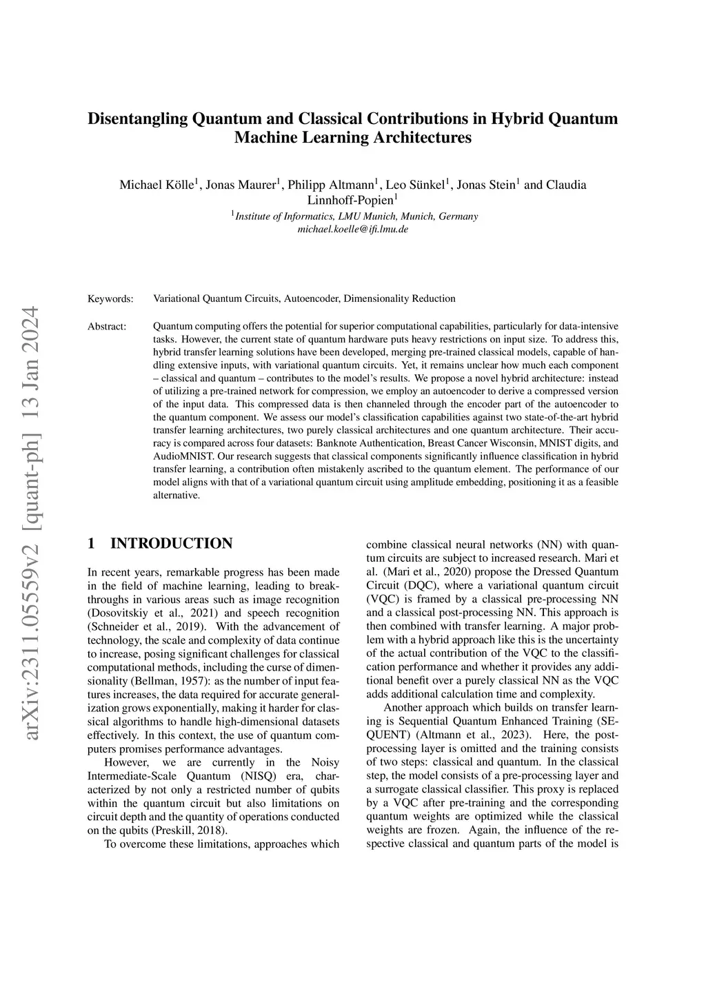 Quantum computing offers the potential for superior computational capabilities, particularly for data-intensive tasks. However, the current state of quantum hardware puts heavy restrictions on input size. To address this, hybrid transfer learning solutions have been developed, merging pre-trained classical models, capable of handling extensive inputs, with variational quantum circuits. Yet, it remains unclear how much each component -- classical and quantum -- contributes to the model's results. We propose a novel hybrid architecture: instead of utilizing a pre-trained network for compression, we employ an autoencoder to derive a compressed version of the input data. This compressed data is then channeled through the encoder part of the autoencoder to the quantum component. We assess our model's classification capabilities against two state-of-the-art hybrid transfer learning architectures, two purely classical architectures and one quantum architecture. Their accuracy is compared across four datasets: Banknote Authentication, Breast Cancer Wisconsin, MNIST digits, and AudioMNIST. Our research suggests that classical components significantly influence classification in hybrid transfer learning, a contribution often mistakenly ascribed to the quantum element. The performance of our model aligns with that of a variational quantum circuit using amplitude embedding, positioning it as a feasible alternative.