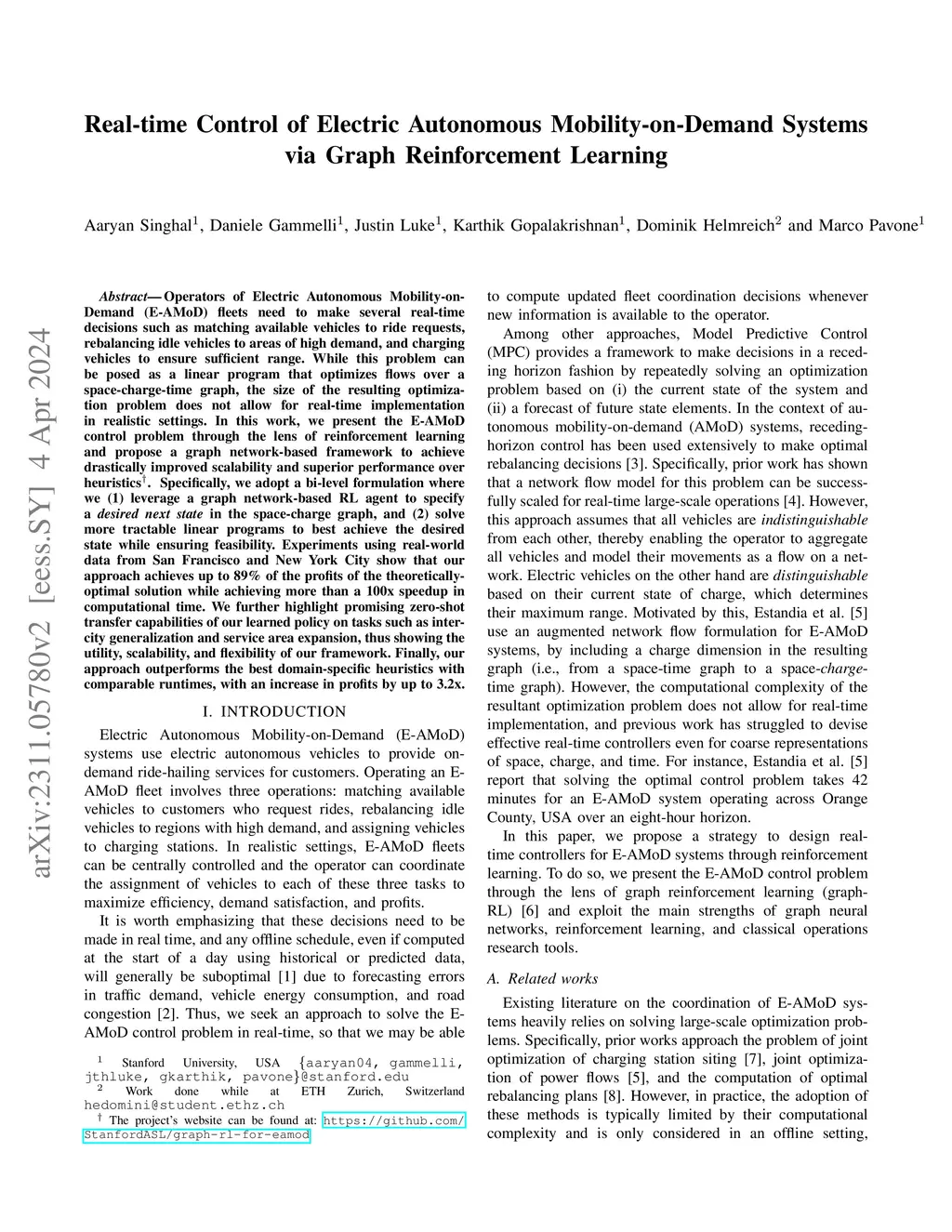 Operators of Electric Autonomous Mobility-on-Demand (E-AMoD) fleets need to make several real-time decisions such as matching available vehicles to ride requests, rebalancing idle vehicles to areas of high demand, and charging vehicles to ensure sufficient range. While this problem can be posed as a linear program that optimizes flows over a space-charge-time graph, the size of the resulting optimization problem does not allow for real-time implementation in realistic settings. In this work, we present the E-AMoD control problem through the lens of reinforcement learning and propose a graph network-based framework to achieve drastically improved scalability and superior performance over heuristics. Specifically, we adopt a bi-level formulation where we (1) leverage a graph network-based RL agent to specify a desired next state in the space-charge graph, and (2) solve more tractable linear programs to best achieve the desired state while ensuring feasibility. Experiments using real-world data from San Francisco and New York City show that our approach achieves up to 89% of the profits of the theoretically-optimal solution while achieving more than a 100x speedup in computational time. We further highlight promising zero-shot transfer capabilities of our learned policy on tasks such as inter-city generalization and service area expansion, thus showing the utility, scalability, and flexibility of our framework. Finally, our approach outperforms the best domain-specific heuristics with comparable runtimes, with an increase in profits by up to 3.2x.