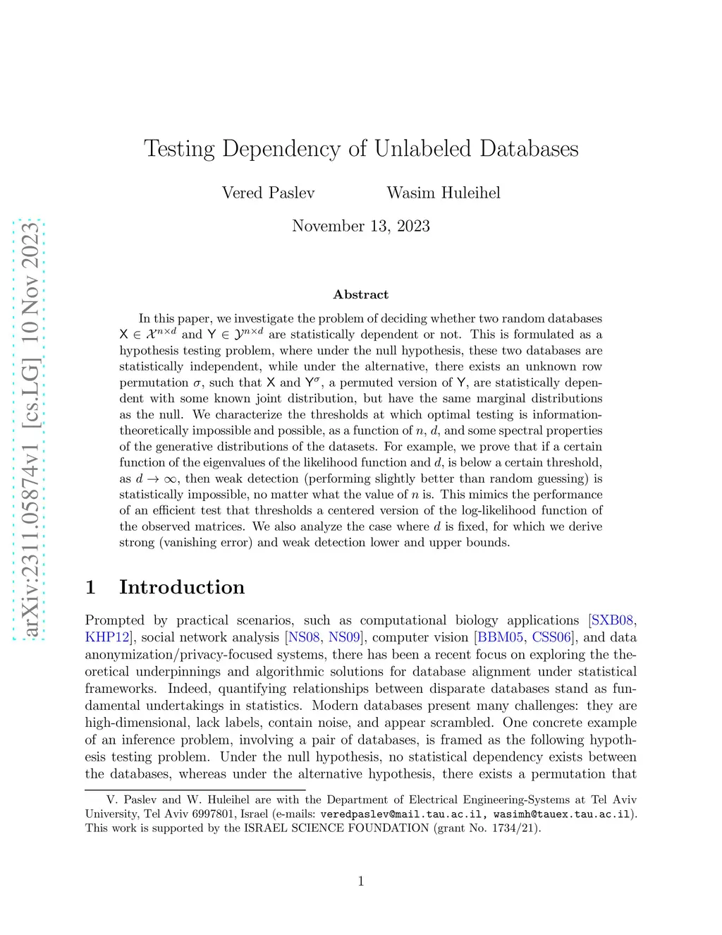 In this paper, we investigate the problem of deciding whether two random databases and are statistically dependent or not. This is formulated as a hypothesis testing problem, where under the null hypothesis, these two databases are statistically independent, while under the alternative, there exists an unknown row permutation , such that and , a permuted version of , are statistically dependent with some known joint distribution, but have the same marginal distributions as the null. We characterize the thresholds at which optimal testing is information-theoretically impossible and possible, as a function of , , and some spectral properties of the generative distributions of the datasets. For example, we prove that if a certain function of the eigenvalues of the likelihood function and , is below a certain threshold, as , then weak detection (performing slightly better than random guessing) is statistically impossible, no matter what the value of is. This mimics the performance of an efficient test that thresholds a centered version of the log-likelihood function of the observed matrices. We also analyze the case where is fixed, for which we derive strong (vanishing error) and weak detection lower and upper bounds.