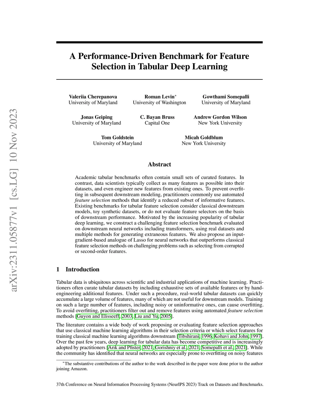 Academic tabular benchmarks often contain small sets of curated features. In contrast, data scientists typically collect as many features as possible into their datasets, and even engineer new features from existing ones. To prevent overfitting in subsequent downstream modeling, practitioners commonly use automated feature selection methods that identify a reduced subset of informative features. Existing benchmarks for tabular feature selection consider classical downstream models, toy synthetic datasets, or do not evaluate feature selectors on the basis of downstream performance. Motivated by the increasing popularity of tabular deep learning, we construct a challenging feature selection benchmark evaluated on downstream neural networks including transformers, using real datasets and multiple methods for generating extraneous features. We also propose an input-gradient-based analogue of Lasso for neural networks that outperforms classical feature selection methods on challenging problems such as selecting from corrupted or second-order features.
