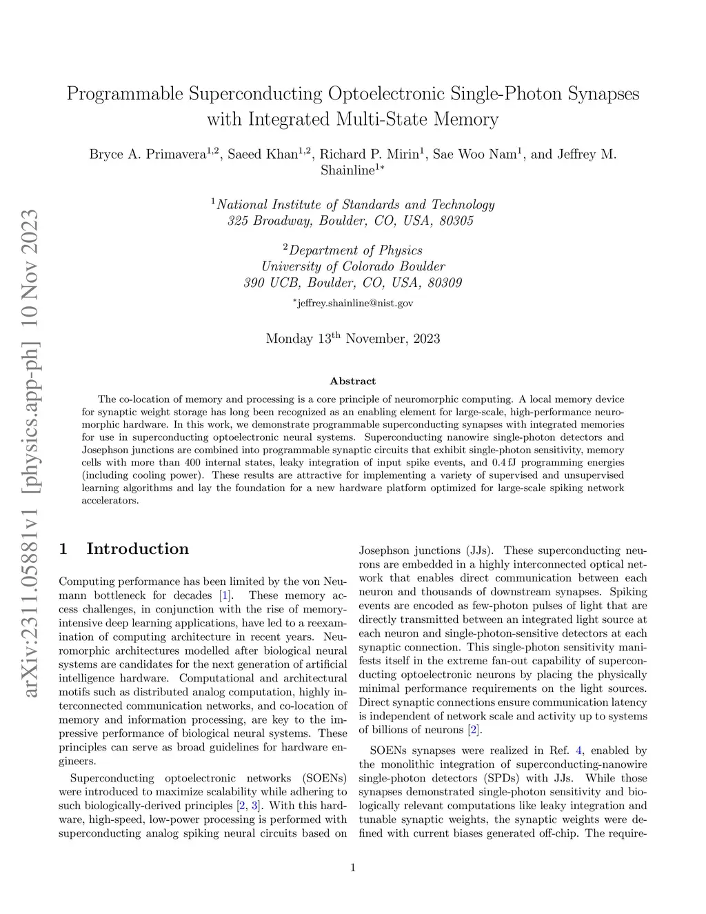 The co-location of memory and processing is a core principle of neuromorphic computing. A local memory device for synaptic weight storage has long been recognized as an enabling element for large-scale, high-performance neuromorphic hardware. In this work, we demonstrate programmable superconducting synapses with integrated memories for use in superconducting optoelectronic neural systems. Superconducting nanowire single-photon detectors and Josephson junctions are combined into programmable synaptic circuits that exhibit single-photon sensitivity, memory cells with more than 400 internal states, leaky integration of input spike events, and 0.4 fJ programming energies (including cooling power). These results are attractive for implementing a variety of supervised and unsupervised learning algorithms and lay the foundation for a new hardware platform optimized for large-scale spiking network accelerators.