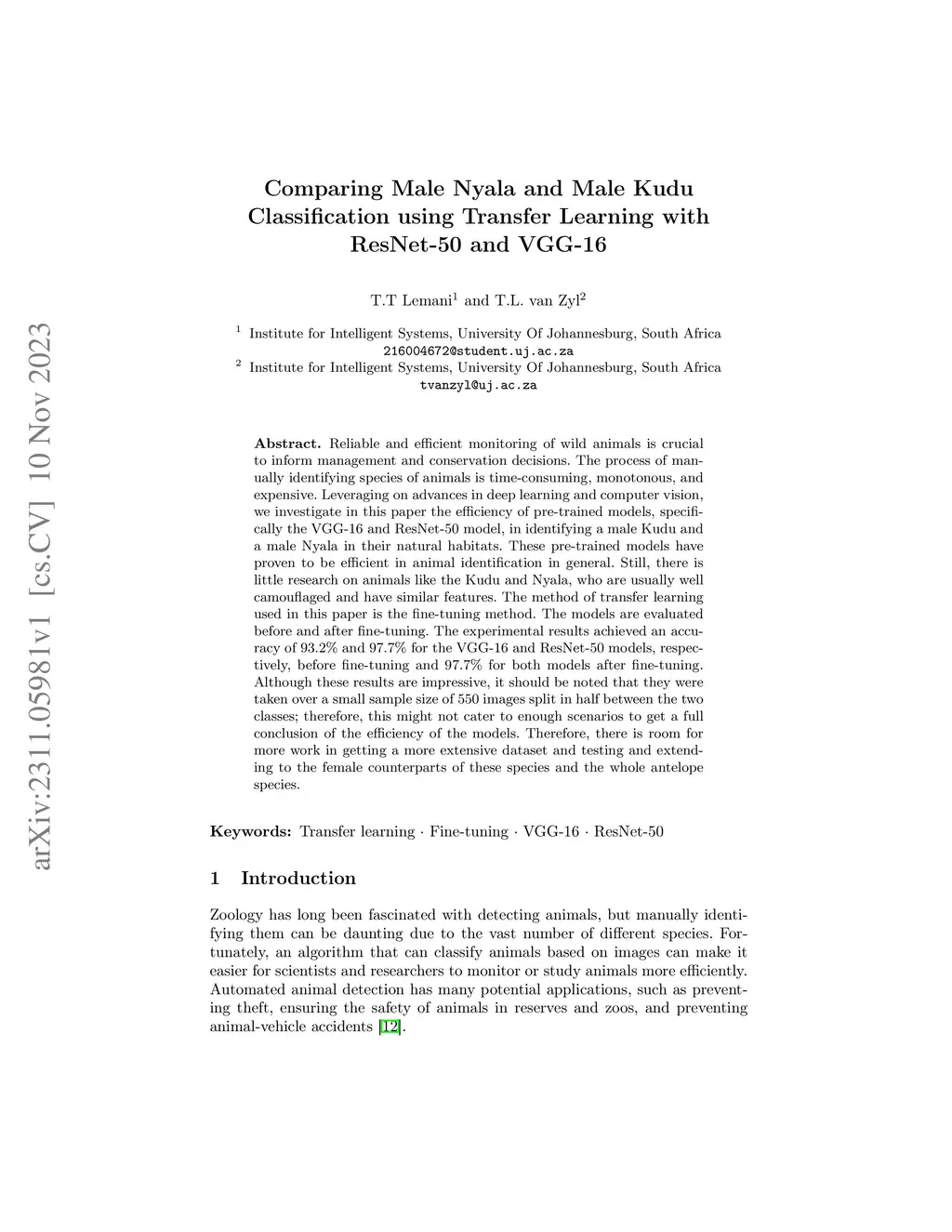 Reliable and efficient monitoring of wild animals is crucial to inform management and conservation decisions. The process of manually identifying species of animals is time-consuming, monotonous, and expensive. Leveraging on advances in deep learning and computer vision, we investigate in this paper the efficiency of pre-trained models, specifically the VGG-16 and ResNet-50 model, in identifying a male Kudu and a male Nyala in their natural habitats. These pre-trained models have proven to be efficient in animal identification in general. Still, there is little research on animals like the Kudu and Nyala, who are usually well camouflaged and have similar features. The method of transfer learning used in this paper is the fine-tuning method. The models are evaluated before and after fine-tuning. The experimental results achieved an accuracy of 93.2\% and 97.7\% for the VGG-16 and ResNet-50 models, respectively, before fine-tuning and 97.7\% for both models after fine-tuning. Although these results are impressive, it should be noted that they were taken over a small sample size of 550 images split in half between the two classes; therefore, this might not cater to enough scenarios to get a full conclusion of the efficiency of the models. Therefore, there is room for more work in getting a more extensive dataset and testing and extending to the female counterparts of these species and the whole antelope species.