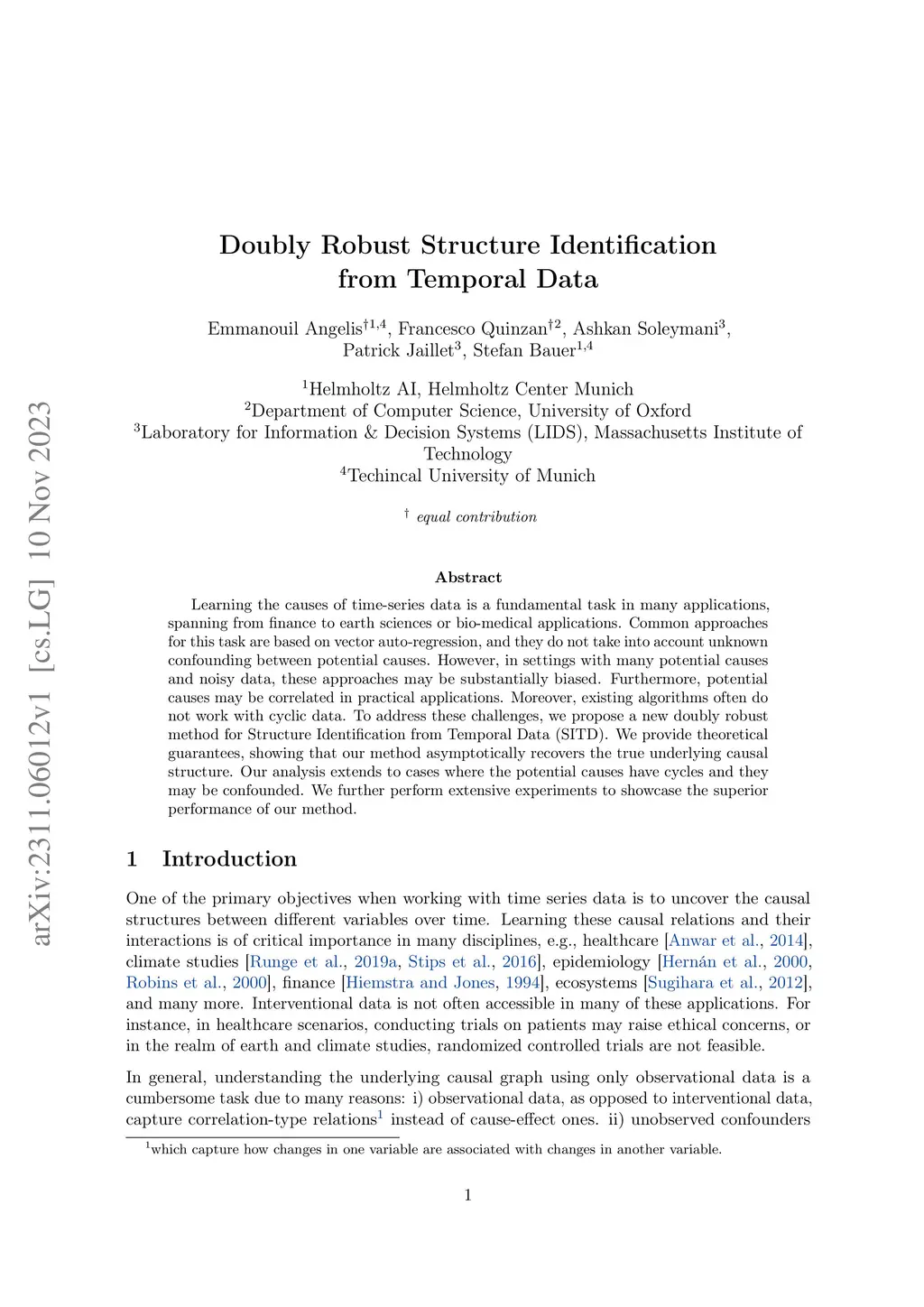 Learning the causes of time-series data is a fundamental task in many applications, spanning from finance to earth sciences or bio-medical applications. Common approaches for this task are based on vector auto-regression, and they do not take into account unknown confounding between potential causes. However, in settings with many potential causes and noisy data, these approaches may be substantially biased. Furthermore, potential causes may be correlated in practical applications or even contain cycles. To address these challenges, we propose a new double machine learning based method for structure identification from temporal data (DR-SIT). We provide theoretical guarantees, showing that our method asymptotically recovers the true underlying causal structure. Our analysis extends to cases where the potential causes have cycles, and they may even be confounded. We further perform extensive experiments to showcase the superior performance of our method. Code:this https URL