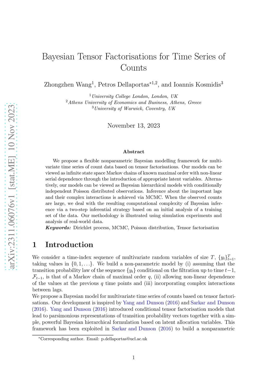 We propose a flexible nonparametric Bayesian modelling framework for multivariate time series of count data based on tensor factorisations. Our models can be viewed as infinite state space Markov chains of known maximal order with non-linear serial dependence through the introduction of appropriate latent variables. Alternatively, our models can be viewed as Bayesian hierarchical models with conditionally independent Poisson distributed observations. Inference about the important lags and their complex interactions is achieved via MCMC. When the observed counts are large, we deal with the resulting computational complexity of Bayesian inference via a two-step inferential strategy based on an initial analysis of a training set of the data. Our methodology is illustrated using simulation experiments and analysis of real-world data.