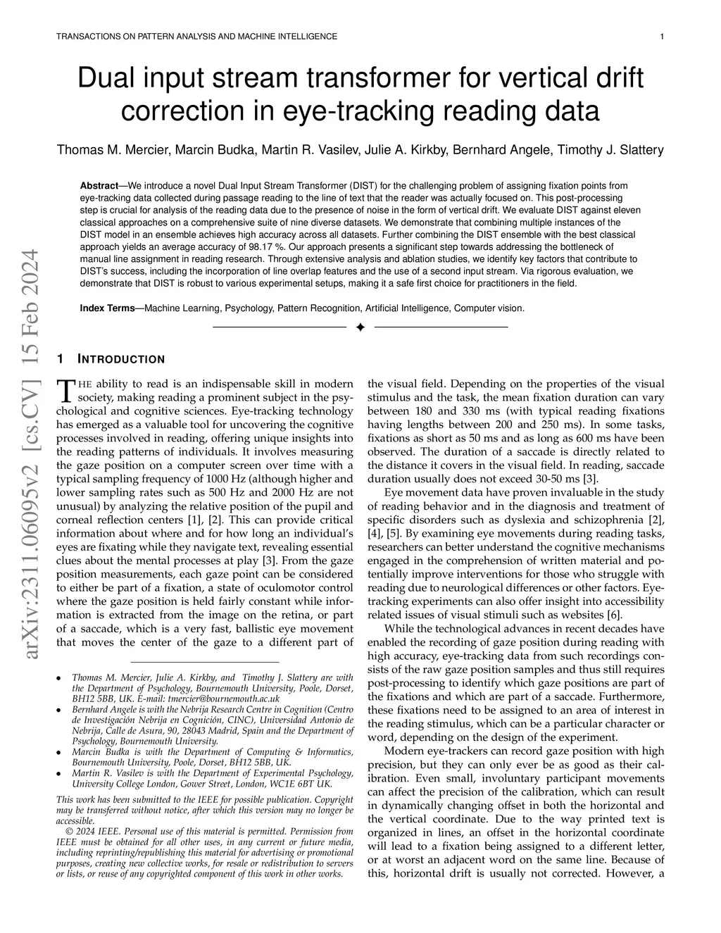 We introduce a novel Dual Input Stream Transformer (DIST) for the challenging problem of assigning fixation points from eye-tracking data collected during passage reading to the line of text that the reader was actually focused on. This post-processing step is crucial for analysis of the reading data due to the presence of noise in the form of vertical drift. We evaluate DIST against eleven classical approaches on a comprehensive suite of nine diverse datasets. We demonstrate that combining multiple instances of the DIST model in an ensemble achieves high accuracy across all datasets. Further combining the DIST ensemble with the best classical approach yields an average accuracy of 98.17 %. Our approach presents a significant step towards addressing the bottleneck of manual line assignment in reading research. Through extensive analysis and ablation studies, we identify key factors that contribute to DIST's success, including the incorporation of line overlap features and the use of a second input stream. Via rigorous evaluation, we demonstrate that DIST is robust to various experimental setups, making it a safe first choice for practitioners in the field.