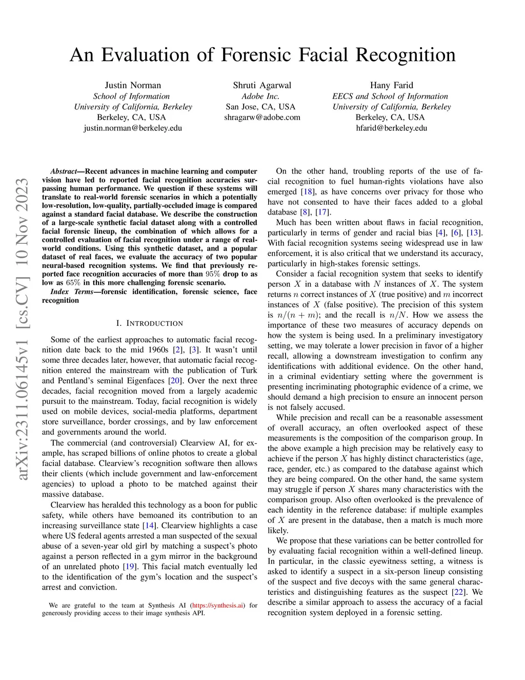 Recent advances in machine learning and computer vision have led to reported facial recognition accuracies surpassing human performance. We question if these systems will translate to real-world forensic scenarios in which a potentially low-resolution, low-quality, partially-occluded image is compared against a standard facial database. We describe the construction of a large-scale synthetic facial dataset along with a controlled facial forensic lineup, the combination of which allows for a controlled evaluation of facial recognition under a range of real-world conditions. Using this synthetic dataset, and a popular dataset of real faces, we evaluate the accuracy of two popular neural-based recognition systems. We find that previously reported face recognition accuracies of more than 95% drop to as low as 65% in this more challenging forensic scenario.